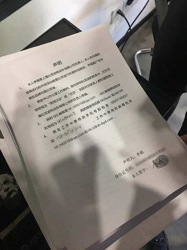 阮姓副總裁在現(xiàn)場(chǎng)出示的一份有“李娟”字樣簽名,且附有指紋的聲明中還提到,在與深圳比亞迪的聯(lián)系中,對(duì)方均稱呼“我為雨鴻汪總或汪總,實(shí)際對(duì)方聯(lián)系人都知道我們上海比亞迪電動(dòng)車公司的負(fù)責(zé)人李娟。”
