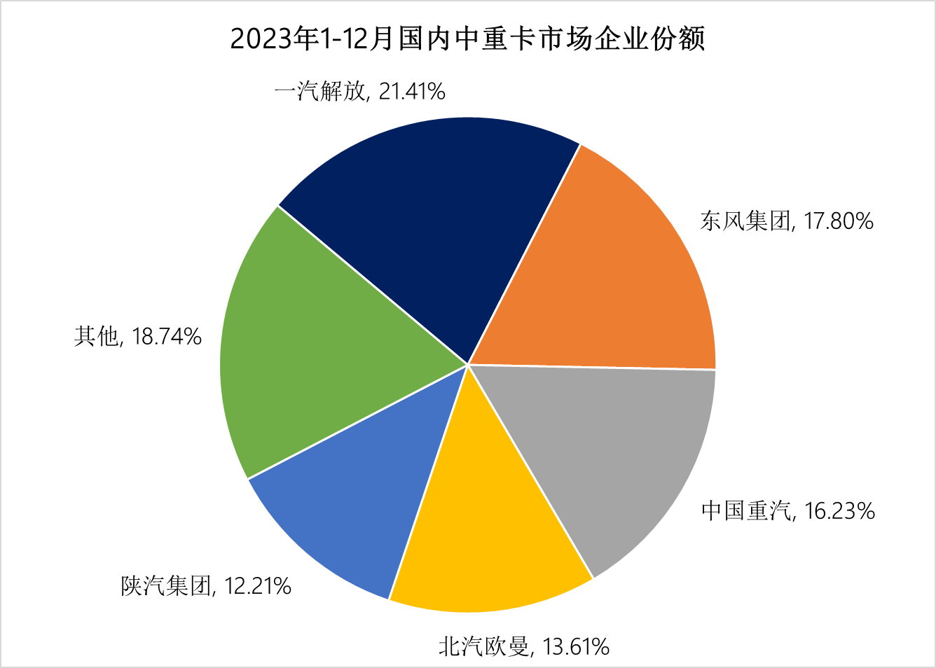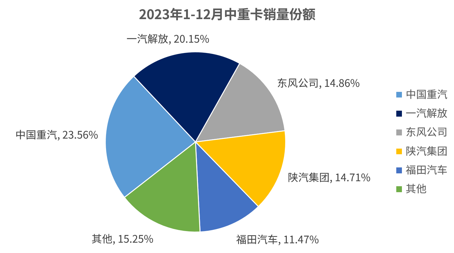 2023年的國(guó)內(nèi)中重卡市場(chǎng),是行業(yè)競(jìng)爭(zhēng)最為白熱化的“主陣地”,全年行業(yè)總銷量近77萬(wàn)輛,同比增長(zhǎng)28.3%。市場(chǎng)份額占10%以上的頭部企業(yè)有五家,分別是:解放21.4%、東風(fēng)17.8%、重汽16.2%、歐曼13.6%和陜汽12.2%。前五強(qiáng)企業(yè)占據(jù)了行業(yè)80%以上的市場(chǎng)份額。