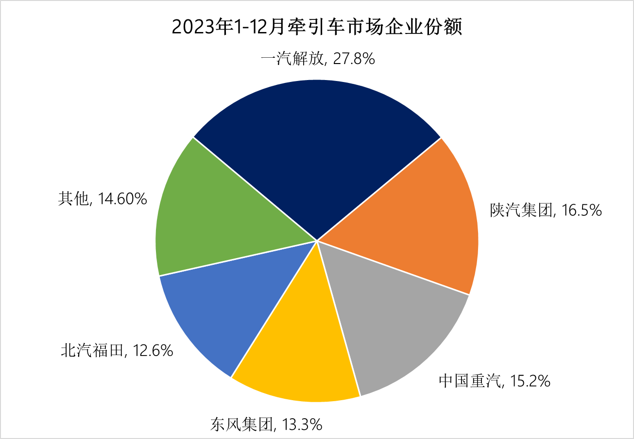 上圖可見(jiàn),大多數(shù)企業(yè)2023年?duì)恳囦N量都實(shí)現(xiàn)了增長(zhǎng),銷量前十企業(yè)中解放、重汽、陜汽、北方奔馳和安徽江淮增速迅猛,分別增長(zhǎng)89.2%、135.8%、60.1%、72.6%和477.9%。在2023年?duì)恳囀袌?chǎng)約15.6萬(wàn)輛的“增量”中,貢獻(xiàn)量最大的是仍是排名首位的解放,牽引車銷量?jī)粼鲩L(zhǎng)4.9萬(wàn)輛,對(duì)整個(gè)市場(chǎng)增量的貢獻(xiàn)度達(dá)到31%;第二名重汽,凈增長(zhǎng)超2萬(wàn)輛,東風(fēng)、陜汽和福田也均增長(zhǎng)超萬(wàn)輛。