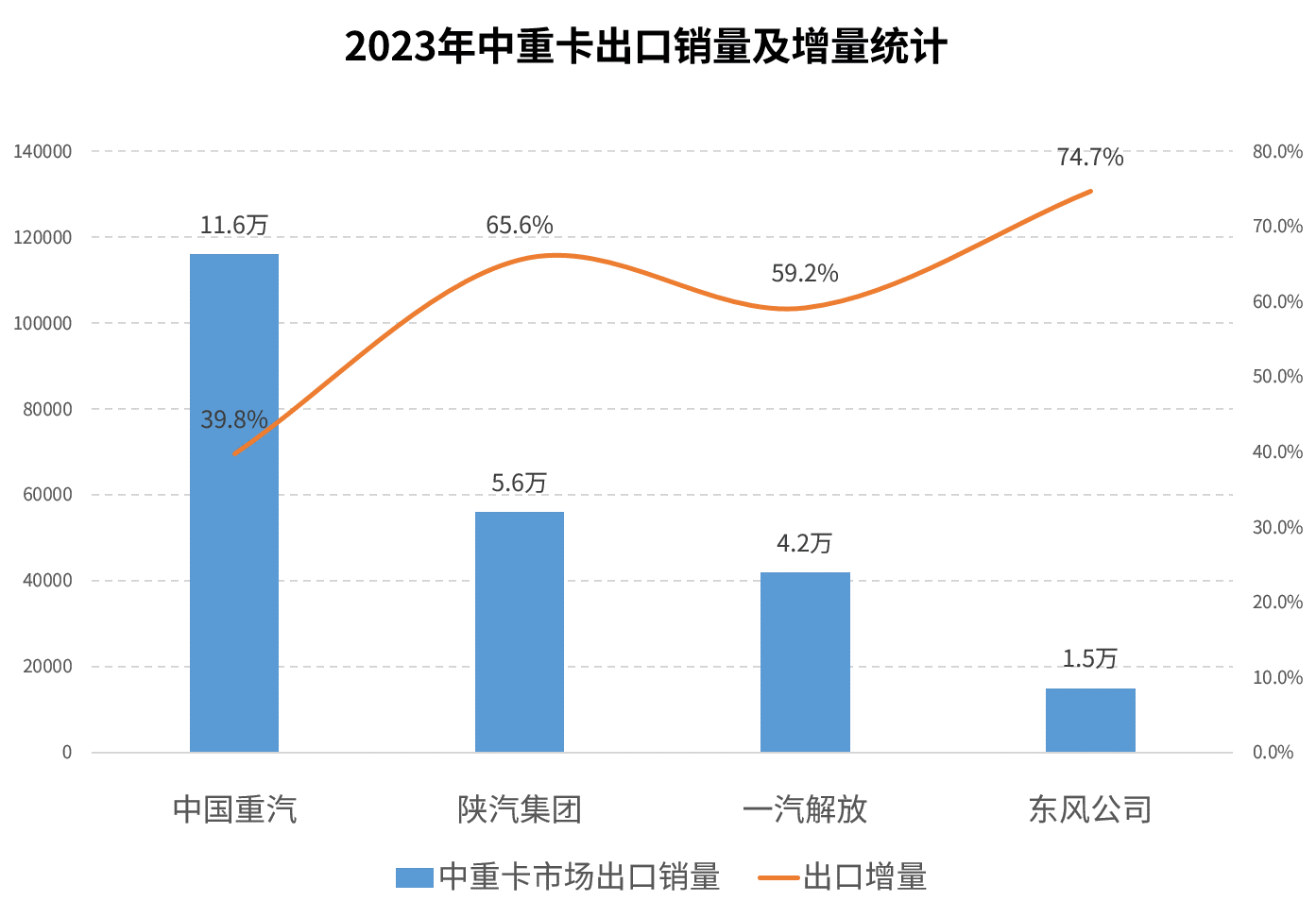 除了上述國(guó)內(nèi)幾個(gè)熱點(diǎn)市場(chǎng)外,出口也是2023年中重卡乃至整個(gè)汽車市場(chǎng)的一大亮點(diǎn),中國(guó)商用車企業(yè)憑借優(yōu)異的產(chǎn)品,積極走出國(guó)門,向全世界展示其發(fā)展成就。據(jù)中汽協(xié)數(shù)據(jù)顯示:2023年我國(guó)汽車出口延續(xù)快速增長(zhǎng),商用車出口77萬(wàn)輛,同比增長(zhǎng)32%。中重卡市場(chǎng),重汽出口銷量以11.6萬(wàn)輛位居首位;陜汽、解放位居其后,出口銷量分別為5.6萬(wàn)輛和4.2萬(wàn)輛;重汽、解放、東風(fēng)、陜汽的出口增量分別達(dá)到39.8%、59.2%、74.7%、65.6%,四大商用車巨頭均跑贏“大盤”。
