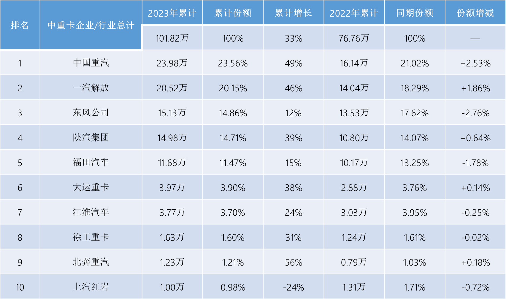 上表可見(jiàn),在中重卡市場(chǎng)全年收獲超3成增長(zhǎng)的大環(huán)境下,絕大多數(shù)企業(yè)都同步實(shí)現(xiàn)了增長(zhǎng)。具體來(lái)看,2023年中重卡銷量前十家“累計(jì)增長(zhǎng)”9增1降,實(shí)現(xiàn)增長(zhǎng)的企業(yè)增幅均達(dá)到兩位數(shù),重汽、解放、陜汽、大運(yùn)和北奔等企業(yè)增幅高于中重卡市場(chǎng)整體33%的增幅,跑贏“大盤”,排名前兩位的重汽和解放中重卡銷量同比分別大增49%和46%,對(duì)2023年中重卡市場(chǎng)的增長(zhǎng)貢獻(xiàn)最大。