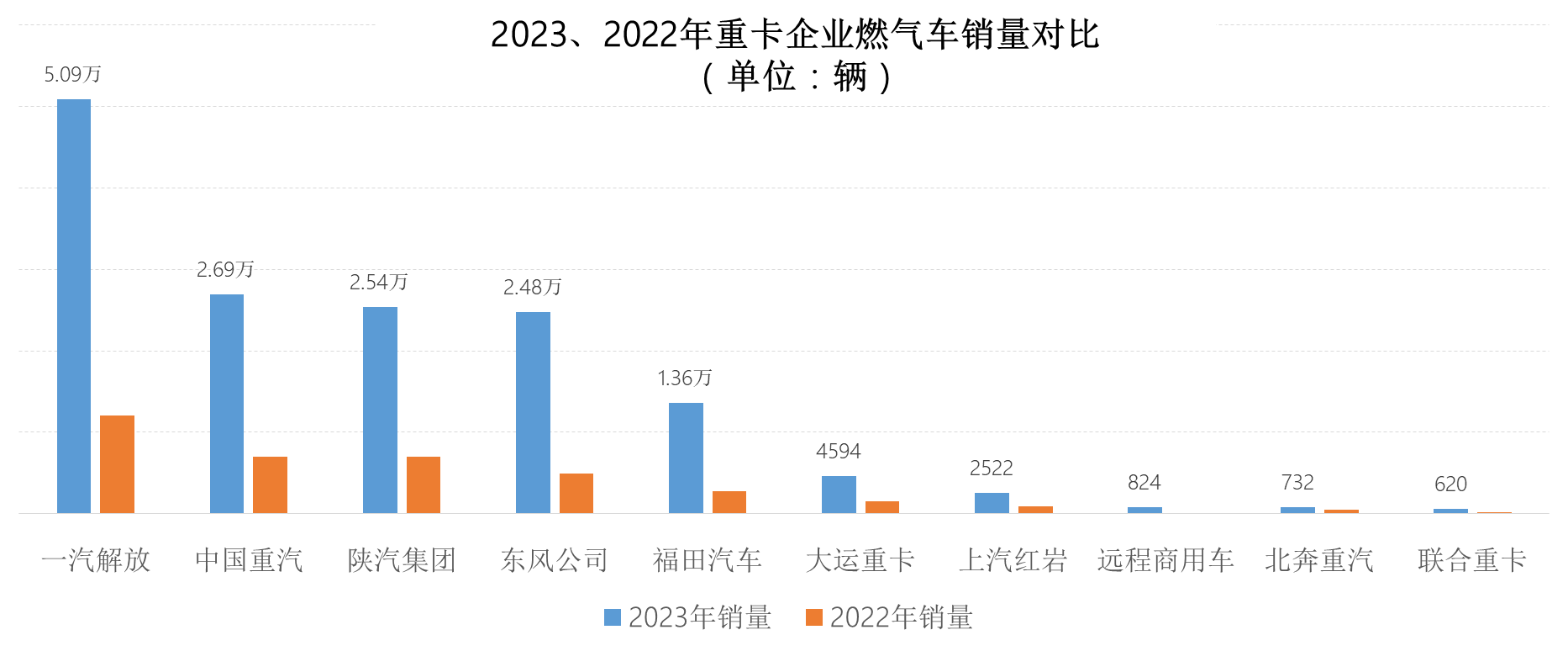 上圖可見(jiàn),銷量前五企業(yè)中,解放、東風(fēng)和福田高于此增幅,分別增長(zhǎng)323%、407%和390%。2023年天然氣重卡市場(chǎng)約11.5萬(wàn)輛的“增量”中,主要由排名靠前的企業(yè)貢獻(xiàn),貢獻(xiàn)最大的是排名第一的解放,燃?xì)廛噧粼鲩L(zhǎng)3.88萬(wàn)輛,對(duì)整個(gè)市場(chǎng)增量的貢獻(xiàn)度超過(guò)1/3;重汽、陜汽、東風(fēng)和福田也均增長(zhǎng)超萬(wàn)輛。