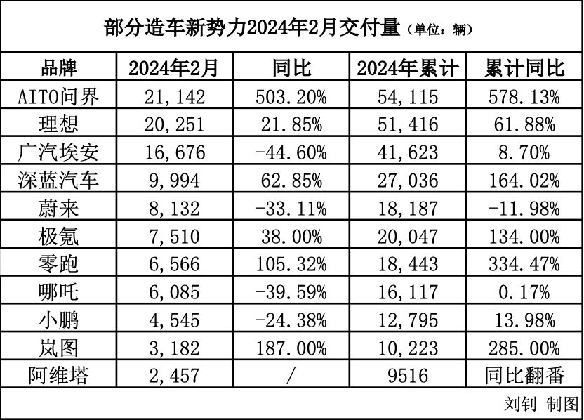 近日,多家造車新勢力陸續(xù)公布2024年2月份交付成績單。受到春節(jié)假期和減少的工作日等客觀因素影響,絕大多數(shù)造車新勢力2月份交付量表現(xiàn)一般,甚至環(huán)比均出現(xiàn)下滑,統(tǒng)計(jì)中11家車企,2月份交付量突破萬輛的僅有3家。其中,AITO問界以21142輛交付量再次奪得造車新勢力月度交付量冠軍,理想汽車以20251輛交付量惜敗AITO問界排名第二,廣汽埃安則以16676輛交付量成績排名第三。