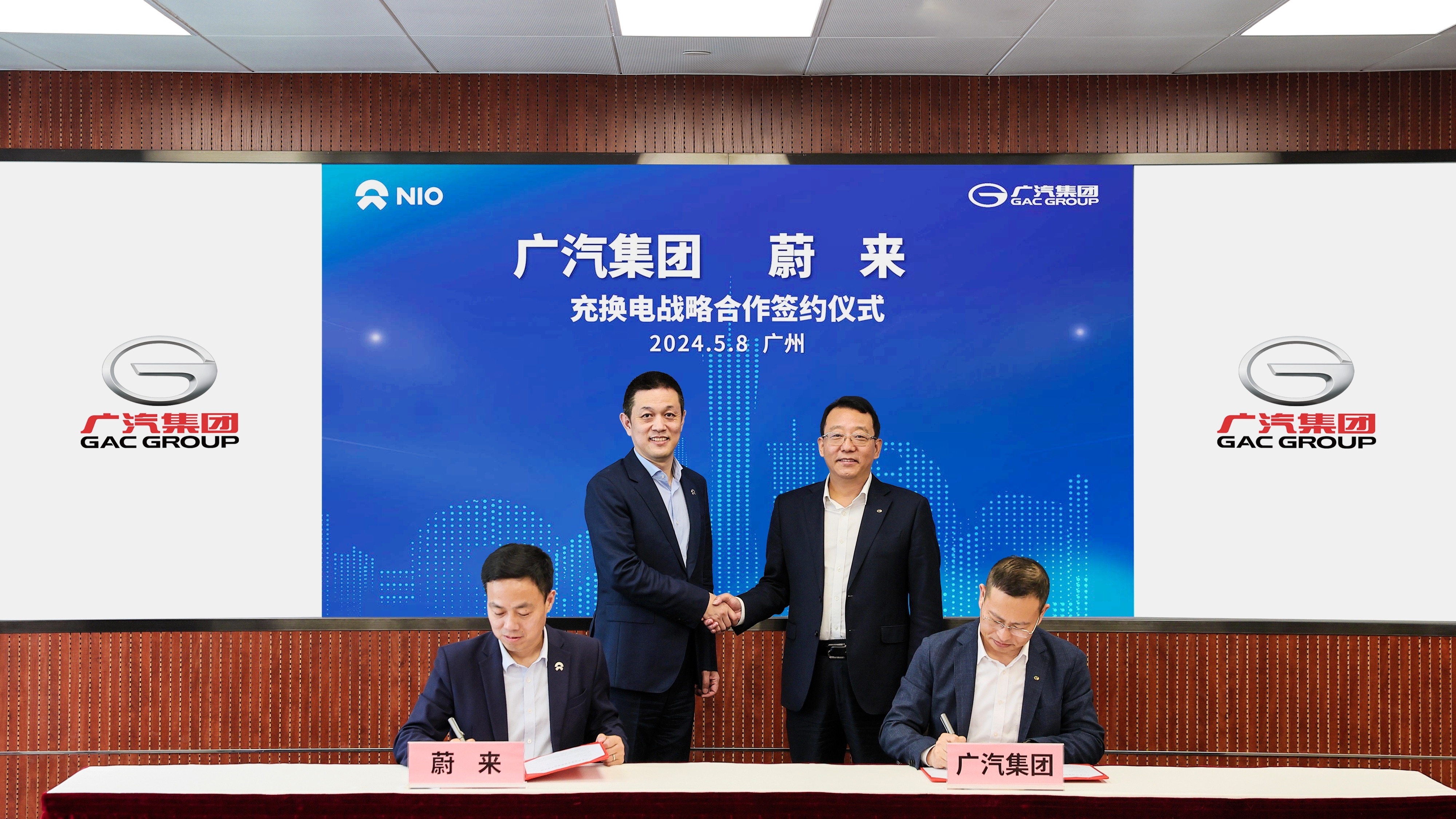2024年5月8日,廣汽集團與蔚來在廣汽中心簽署充換電戰(zhàn)略合作協(xié)議。在廣汽集團總經(jīng)理馮興亞及蔚來創(chuàng)始人李斌的共同見證下,廣汽集團副總經(jīng)理閤先慶與蔚來高級副總裁沈斐代表雙方簽約。
