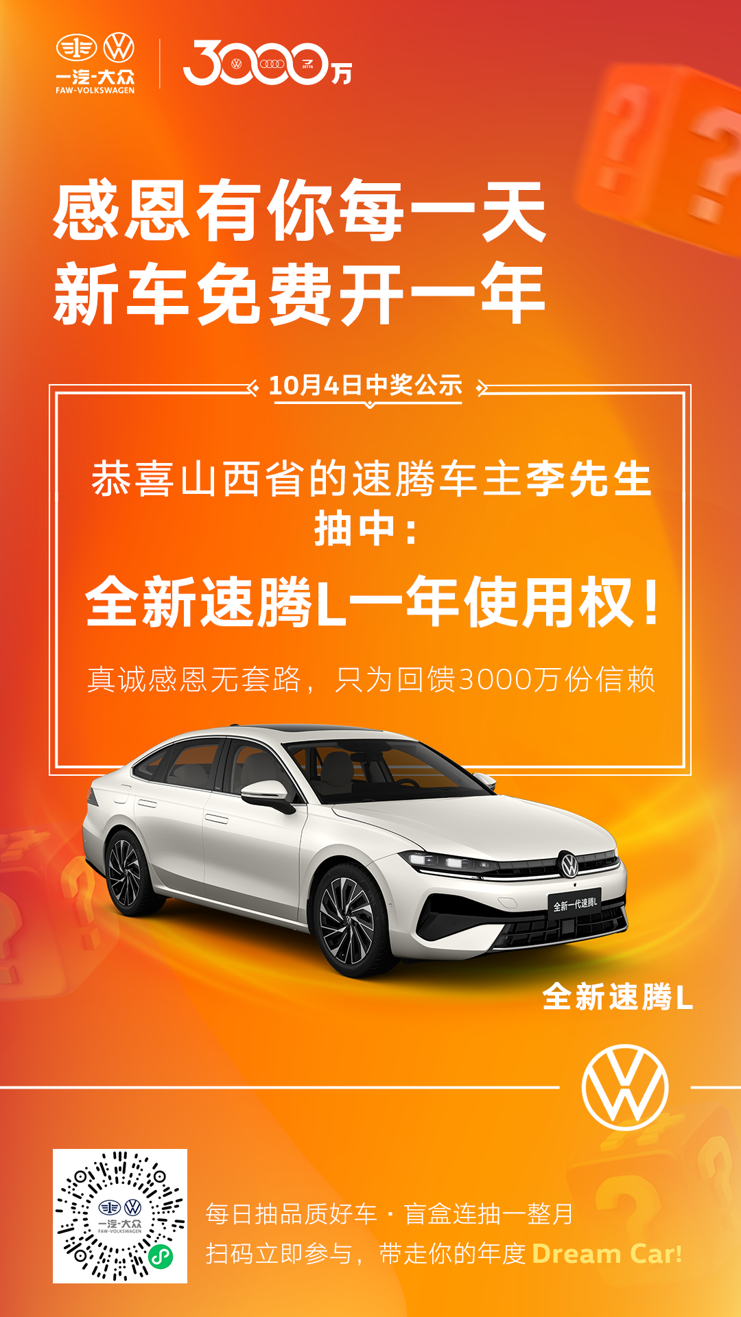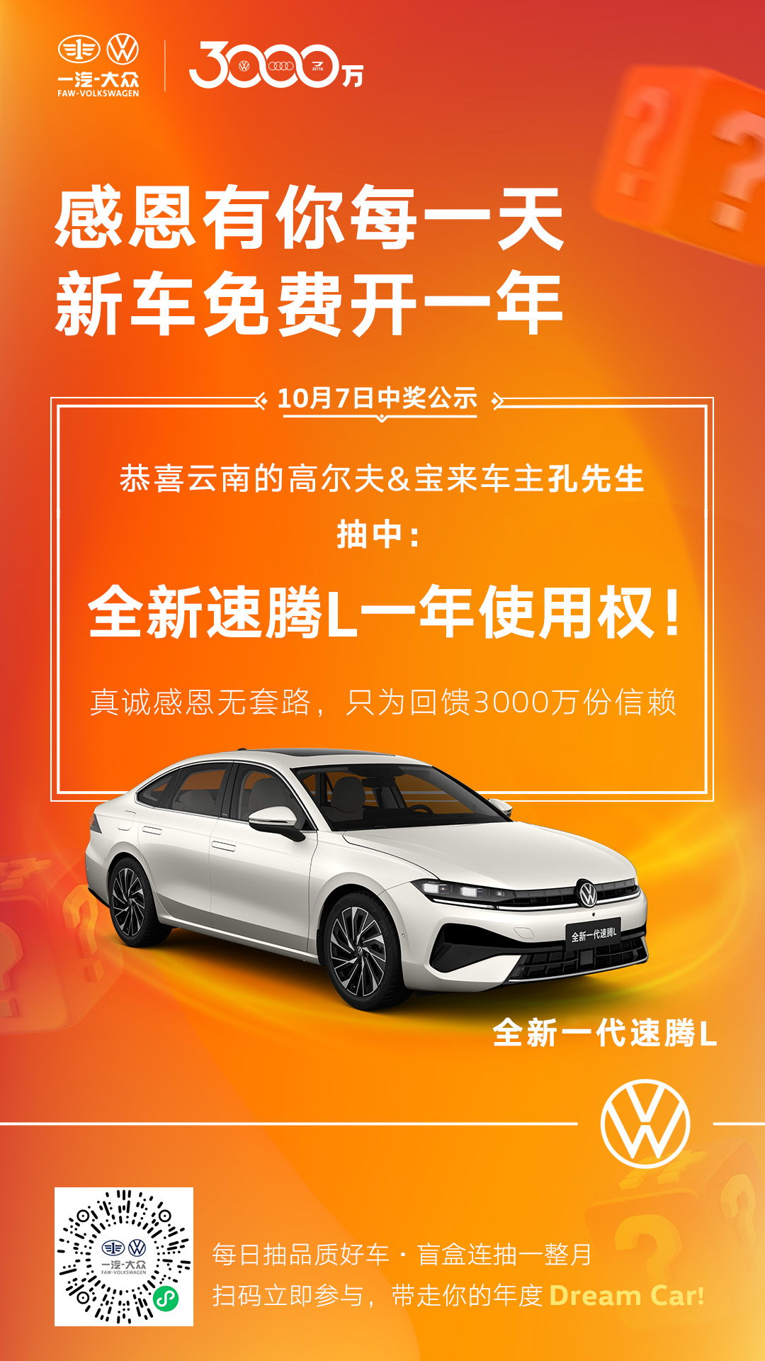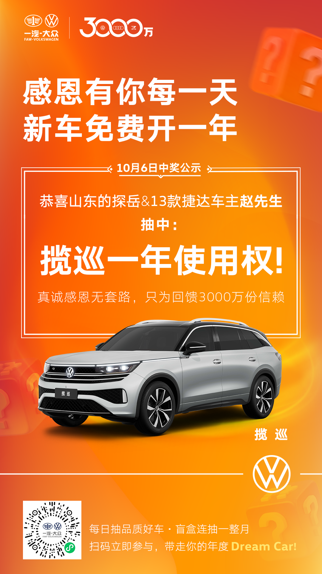 規(guī)模之上是責(zé)任,這份責(zé)任既是對(duì)品質(zhì)的堅(jiān)守,也是對(duì)客戶的承諾,一汽-大眾將“可靠”從產(chǎn)品品質(zhì)延伸至服務(wù)領(lǐng)域。為答謝3000萬(wàn)客戶的支持與信賴,一汽-大眾特別推出“3000萬(wàn)用戶感恩禮”——車主報(bào)名抽取新車“免費(fèi)開一年”使用權(quán),大眾品牌吸引超過64000位車主報(bào)名參與。十一長(zhǎng)假期間共誕生八位“幸運(yùn)星”,分別獲得全新攬境、攬巡、全新探岳L、全新一代速騰L及全新一代邁騰車型的一年使用權(quán)。目前該活動(dòng)仍在火熱進(jìn)行中,10月27日前仍可報(bào)名參與。