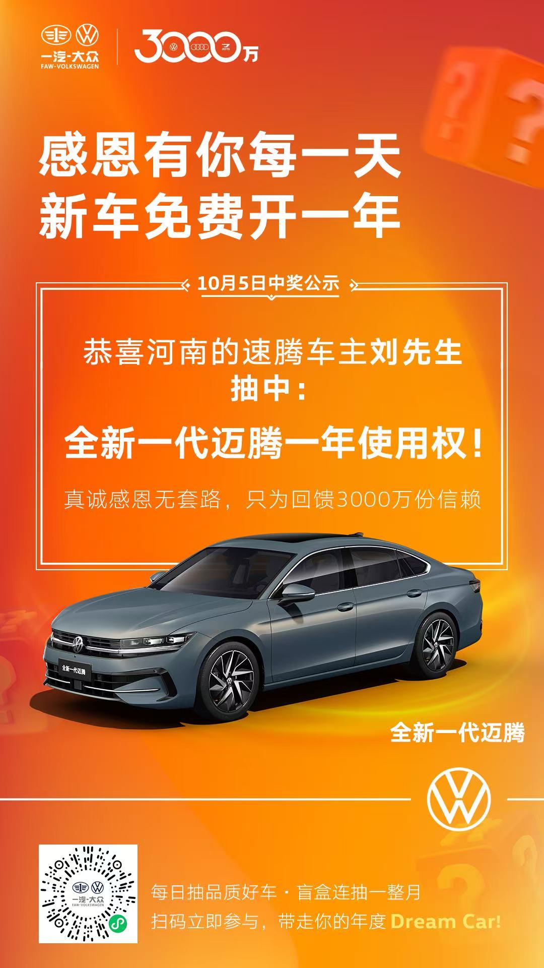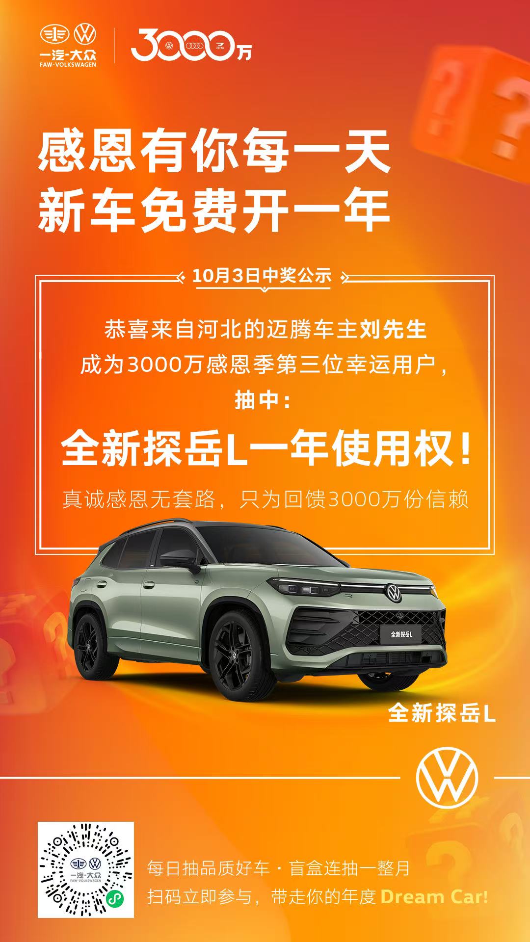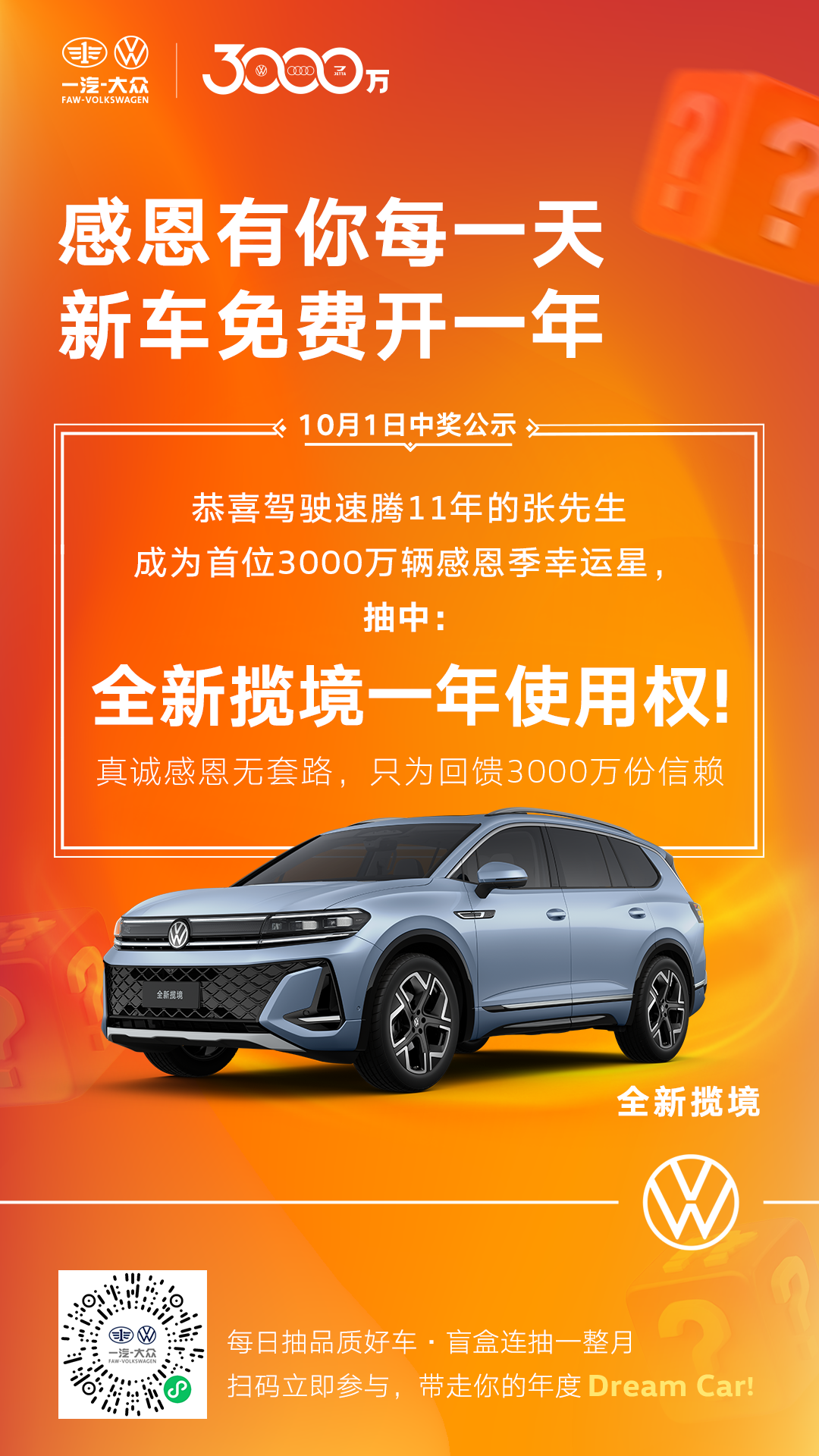 規(guī)模之上是責(zé)任,這份責(zé)任既是對(duì)品質(zhì)的堅(jiān)守,也是對(duì)客戶的承諾,一汽-大眾將“可靠”從產(chǎn)品品質(zhì)延伸至服務(wù)領(lǐng)域。為答謝3000萬(wàn)客戶的支持與信賴,一汽-大眾特別推出“3000萬(wàn)用戶感恩禮”——車主報(bào)名抽取新車“免費(fèi)開一年”使用權(quán),大眾品牌吸引超過64000位車主報(bào)名參與。十一長(zhǎng)假期間共誕生八位“幸運(yùn)星”,分別獲得全新攬境、攬巡、全新探岳L、全新一代速騰L及全新一代邁騰車型的一年使用權(quán)。目前該活動(dòng)仍在火熱進(jìn)行中,10月27日前仍可報(bào)名參與。