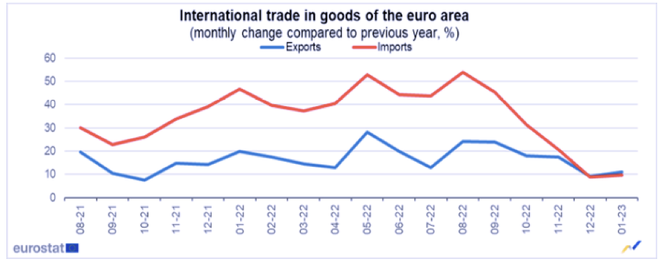 3月20日,歐盟統(tǒng)計(jì)局發(fā)布的最新數(shù)據(jù)顯示,1月份,歐元區(qū)出口達(dá)2229億歐元,同比增長(zhǎng)11.0%;進(jìn)口達(dá)2535億歐元,同比增長(zhǎng)9.7%;未經(jīng)季節(jié)調(diào)整的貿(mào)易逆差為306億歐元,2022年1月份時(shí)錄得逆差為302億歐元。