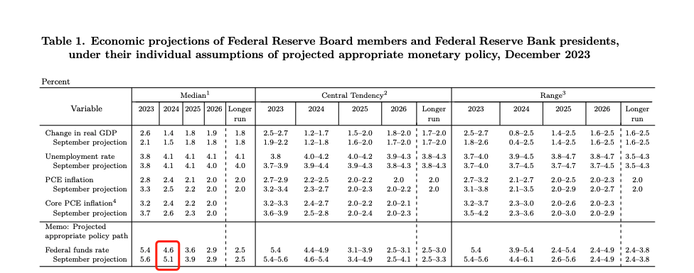 如武澤偉所言,業(yè)內(nèi)目前普遍認(rèn)為美聯(lián)儲(chǔ)的加息操作基本已“落幕”,開(kāi)始押注此后的降息操作。而在本次議息會(huì)議發(fā)布的季度經(jīng)濟(jì)預(yù)測(cè)報(bào)告中,美聯(lián)儲(chǔ)也發(fā)出了迄今為止最明確的降息信號(hào)。美聯(lián)儲(chǔ)點(diǎn)陣圖暗示2024年末聯(lián)邦基金利率水平為4.6%,較9月份預(yù)期(5.1%)下修。從當(dāng)前時(shí)點(diǎn)看,這意味著2024年美聯(lián)儲(chǔ)將降息75個(gè)基點(diǎn)。
