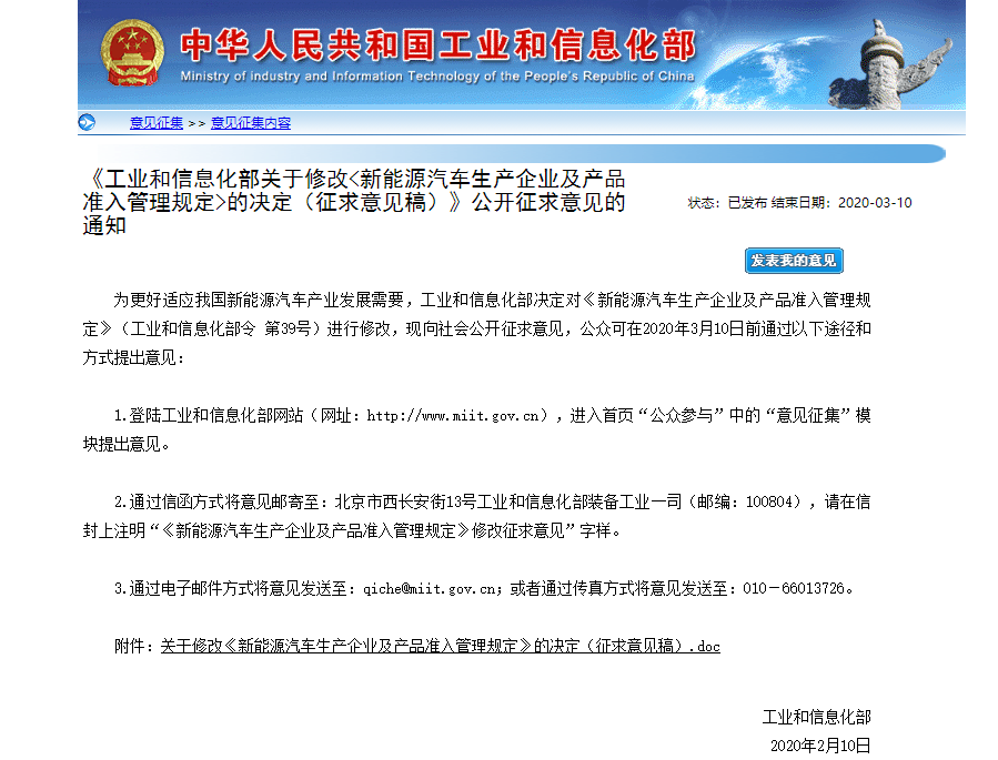 為更好適應(yīng)我國(guó)新能源汽車產(chǎn)業(yè)發(fā)展需要,2月10日,工信部發(fā)布《工業(yè)和信息化部關(guān)于修改新能源汽車生產(chǎn)企業(yè)及產(chǎn)品準(zhǔn)入管理規(guī)定的決定(征求意見稿)》公開征求意見的通知,現(xiàn)向社會(huì)公開征求意見,公眾可在2020年3月10日前提出意見。