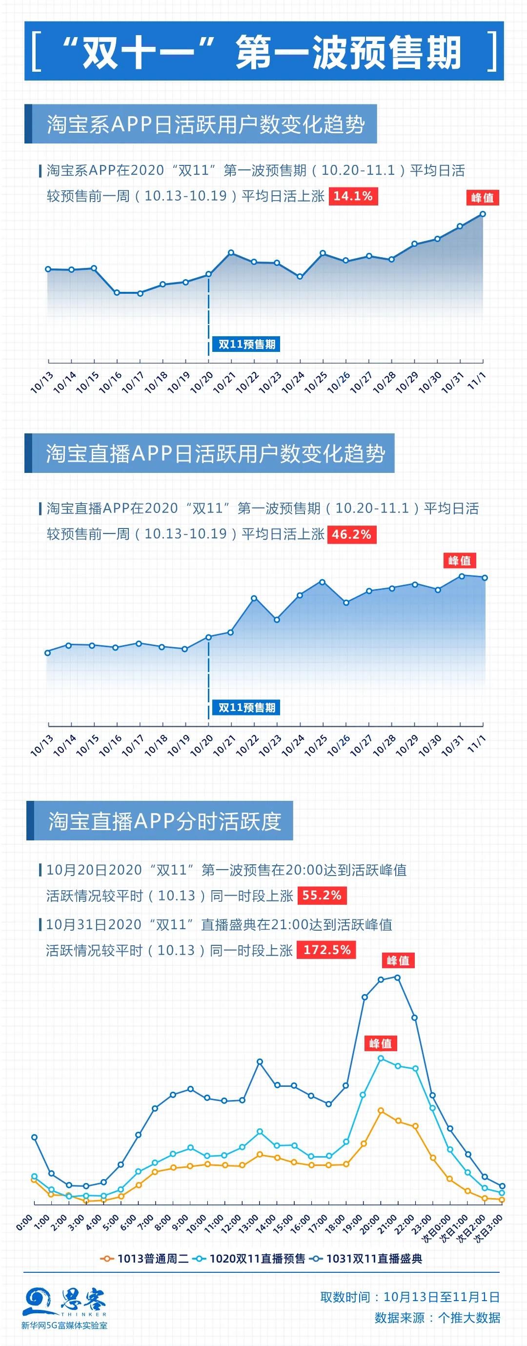 每日互動大數(shù)據(jù)顯示,淘寶直播APP在“雙11”第一波預(yù)售期(10月20日至11月1日)的平均日活較預(yù)售前一周(10月13日至19日)上漲46.2%,每天晚上8-9時(shí)是活躍度最高的時(shí)段,10月31日晚9時(shí)的活躍峰值較10月13日同一時(shí)段上漲172.5%。