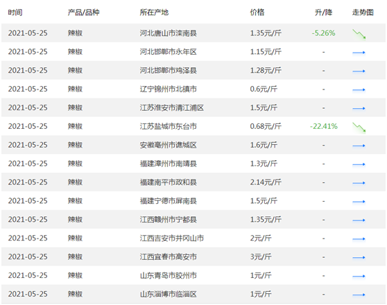在豬肉價(jià)格下跌的同時(shí),辣椒價(jià)格也迎來了一輪快速跳水。惠農(nóng)網(wǎng)大數(shù)據(jù)顯示,5月25日,河北、遼寧、江蘇、安徽、福建、江西、山東等多地的辣椒現(xiàn)貨價(jià)格已經(jīng)跌至1元/斤至2元/斤的區(qū)間內(nèi)。其中,江蘇鹽城的辣椒現(xiàn)貨受新貨上市影響,一度大跌22.41%,批發(fā)價(jià)格跌到0.68元/斤。
