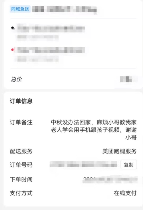美團(tuán)跑腿數(shù)據(jù)顯示,在跑腿訂單中有不少是請小哥幫助家中老人的內(nèi)容,最常見的訂單包括“上門調(diào)試電信網(wǎng)絡(luò)電視節(jié)目、教會老人開機(jī)選節(jié)目,謝謝”、“在樓下扶老人上樓謝謝”、“給老人取熬制好的中藥一袋,請跑腿帥哥注意行車安全!”、“麻煩幫助老人使用智能手機(jī),懂得怎么操作視頻通話就可以”……這些各種各樣的跑腿訂單里,滿滿都是愛意。