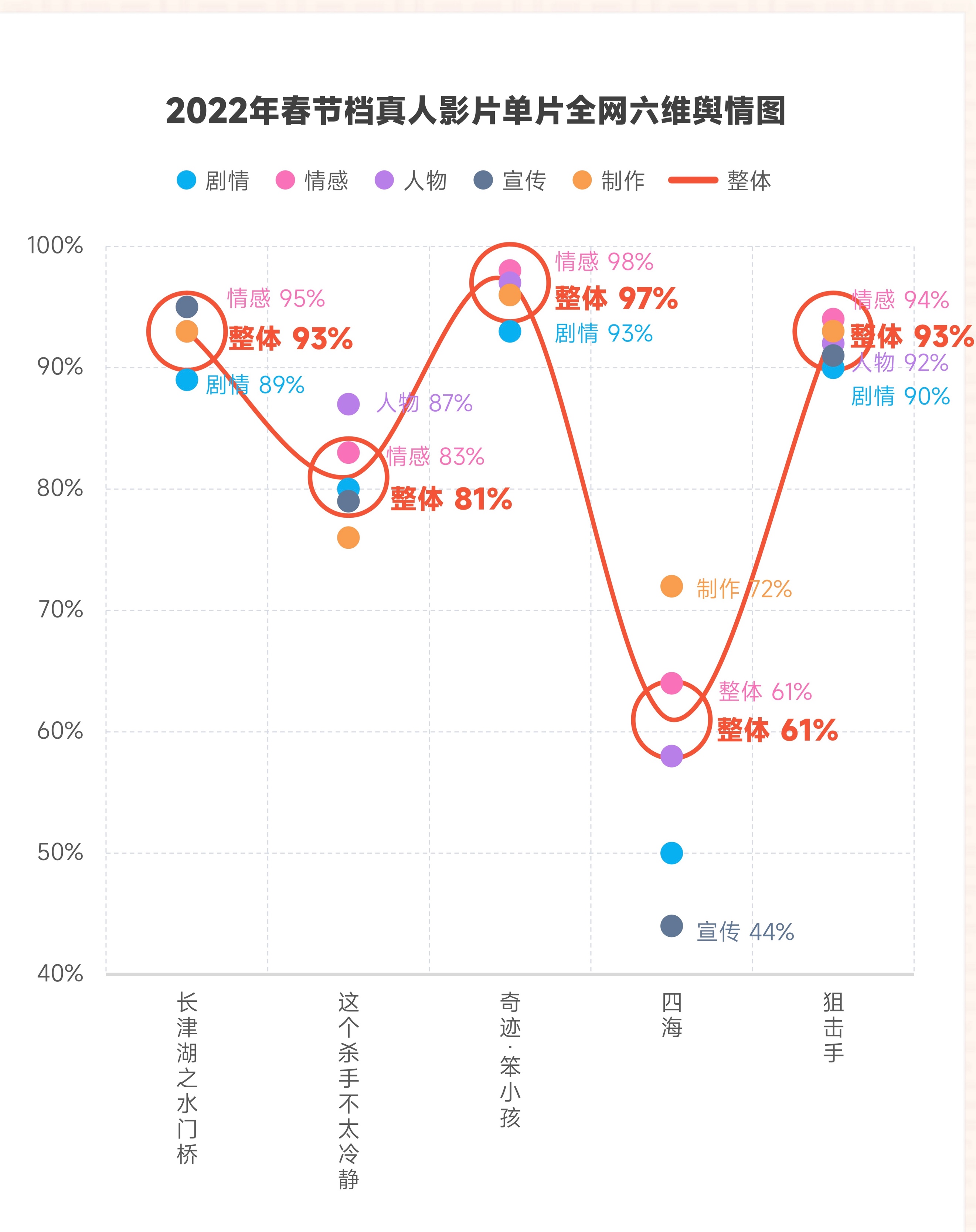 2022春節(jié)檔,影片口碑與票房體量相輔相成。根據(jù)燈塔報告,《長津湖之水門橋》《奇跡·笨小孩》《狙擊手》整體口碑表現(xiàn)優(yōu)異,票房走勢穩(wěn)??;《這個殺手不太冷靜》在細(xì)分輿情中的人物、情感維度表現(xiàn)優(yōu)異,將“笑”發(fā)揮到極致,助益票房。