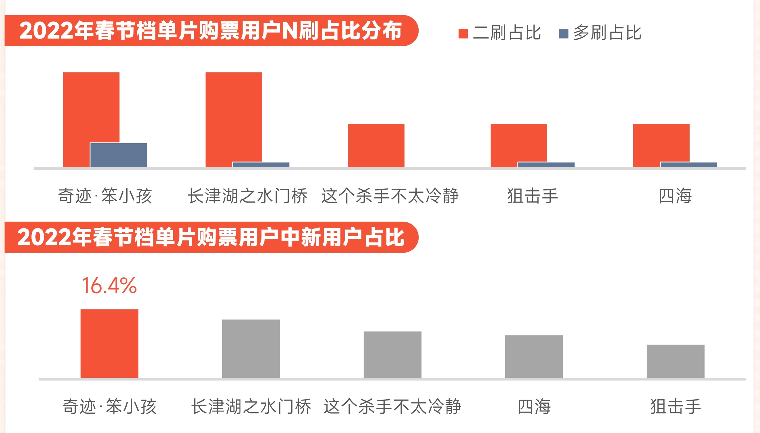 《奇跡·笨小孩》是最能“拉新”的影片,燈塔報告顯示,該片購票用戶中的新用戶占比達(dá)到16.4%,為檔期最高;此外,《奇跡·笨小孩》購票用戶的“二刷”(重復(fù)購票)占比,和《長津湖之水門橋》同為檔期最高。