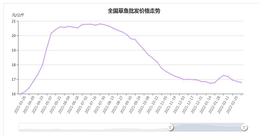 全國草魚批發(fā)價格尚處于低位(國家商務(wù)部數(shù)據(jù)中心)