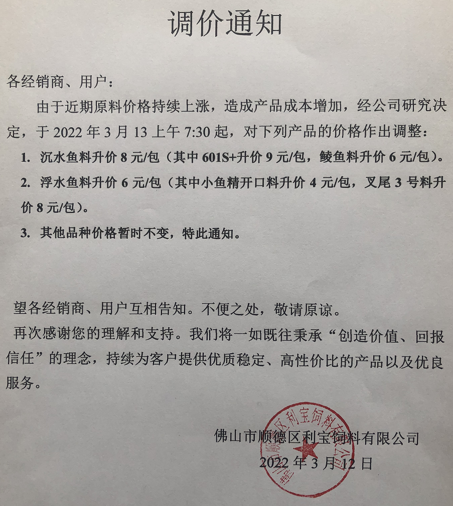 繼飼料企業(yè)上調(diào)生豬、禽類飼料價格之后,3月11日至12日,多家飼料企業(yè)發(fā)布調(diào)價函上調(diào)水產(chǎn)飼料價格。其中,珠海容川將羅非魚魚料每噸上調(diào)240元,對蝦配料每噸上調(diào)200元,泥鰍料每噸上調(diào)200元;珠海海龍將大草魚膨化料每噸上調(diào)240元,其他草魚膨化料每噸上調(diào)200元;廣東通威將普通草魚膨化料每件上調(diào)5元,羅非魚膨化料每件上調(diào)6元;揭陽通威將膨化料每噸上調(diào)280元,沉水料每噸上調(diào)200元,牛蛙料每噸上調(diào)400元;江門恒興將草魚膨化料每噸上調(diào)200元,羅非魚膨化料每噸上調(diào)240元;佛山金浦、順德利寶、福建鷺江、福建粵海、福建澳華、湖南大北農(nóng)、福建傲農(nóng)、漳州海之味等飼料企業(yè)也發(fā)布水產(chǎn)飼料調(diào)價函,調(diào)價幅度與同行相近。
