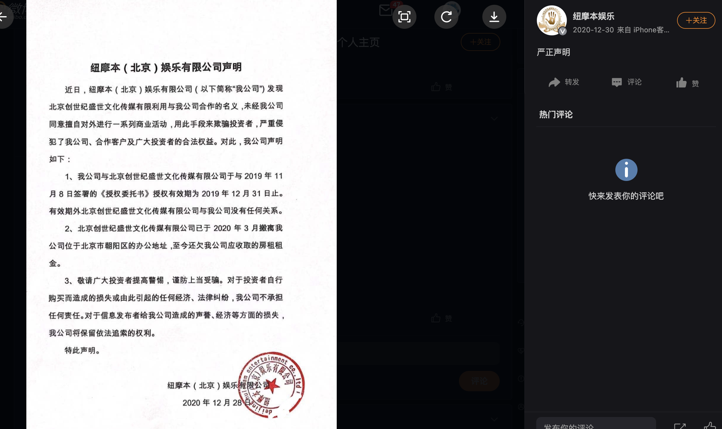 令人意外的是,2020年12月28日,紐摩本官方微博曾發(fā)布聲明稱:我公司2019年11月8日與創(chuàng)世紀簽署的《授權(quán)委托書》授權(quán)有效期為2019年12月31日止,有效期外創(chuàng)世紀與紐摩本沒有任何關(guān)系。