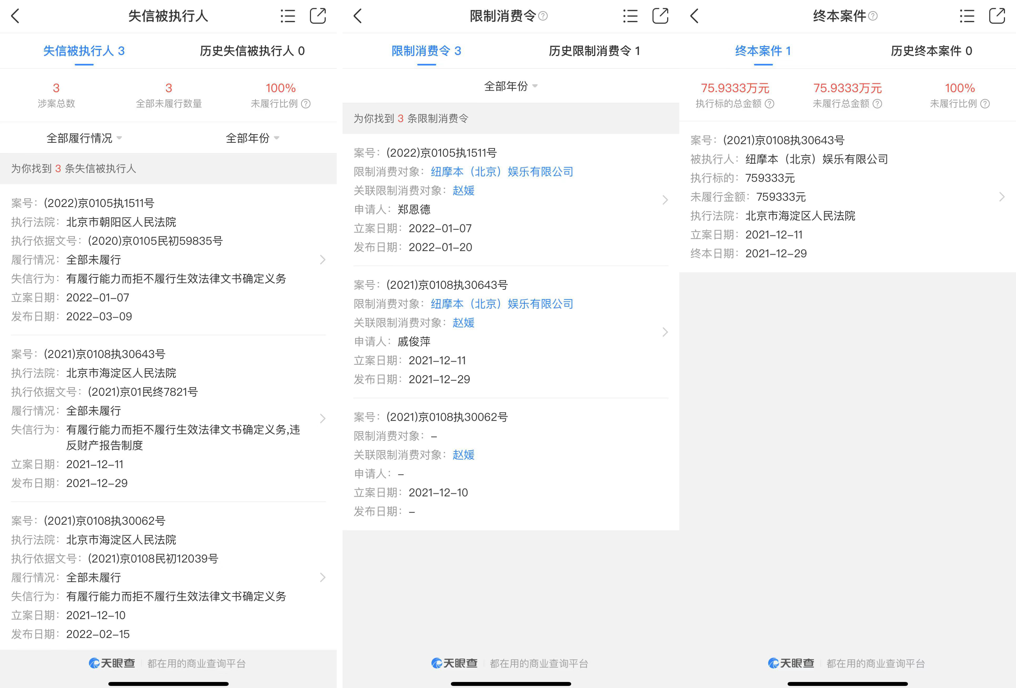 天眼查App顯示,創(chuàng)世紀涉及法律訴訟7起,七成以上是合同糾紛,其中6起處于一審狀態(tài)。而紐摩本涉及法律訴訟17起,其中11起處于一審狀態(tài),均為合同糾紛,2021年12月1日紐摩本已被列為限制高消費企業(yè),同月被列為失信執(zhí)行人。當前,紐摩本被執(zhí)行總金額85.52萬元,終本案件1起,被執(zhí)行總金額75.93萬元,法人趙媛也被“限高”。