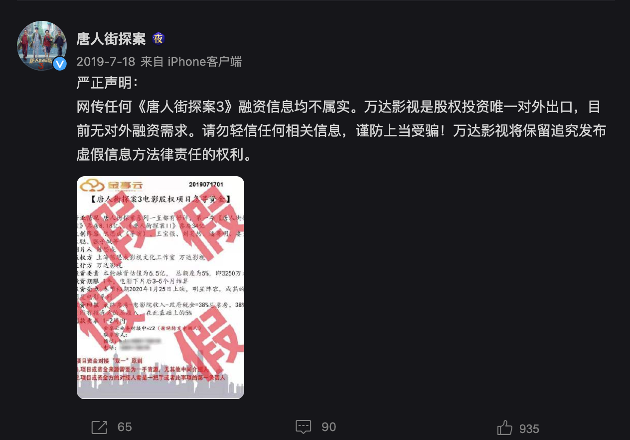 早在2019年7月份,《唐人街探案》官方微博就公開表示:“網(wǎng)傳任何《唐探3》融資信息均不屬實。萬達影視是股權(quán)投資唯一對外出口,目前無對外融資需求。”