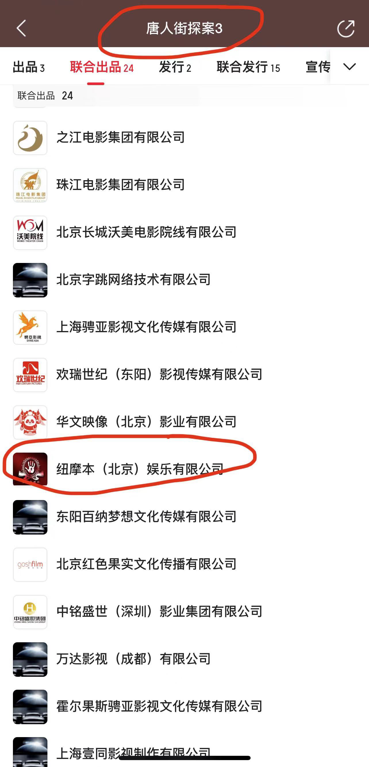 據(jù)多位投資者轉(zhuǎn)述,馬鉑倫曾表示,紐摩本的投資份額來自萬達電影(萬達影視母公司)。貓眼信息顯示,《唐探3》有24家聯(lián)合出品方,紐摩本是其中之一。因此,投資者對馬鉑倫的說法深信不疑。