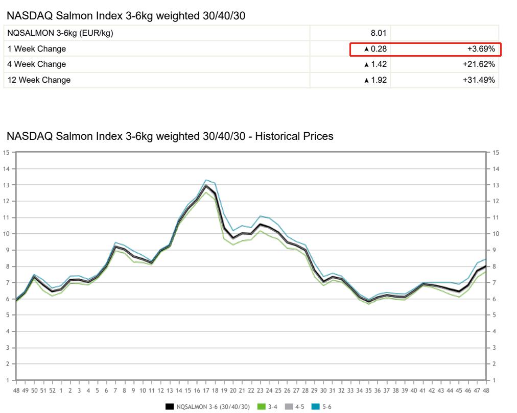 納斯達(dá)克三文魚報(bào)價(jià)指數(shù)顯示,今年第48周(11月21日至11月26日),國(guó)際三文魚價(jià)格率先啟動(dòng),3公斤至6公斤成魚均價(jià)單周漲幅為3.69%,報(bào)每公斤8.01歐元。