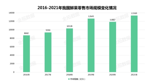 (全拓數(shù)據(jù):2016至2021年我國鮮果零售市場規(guī)模變化情況)