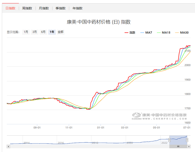 7月5日,康美中藥網(wǎng)發(fā)布的中國中藥材價格總指數(shù)報收于2145.80點,較去年同期上漲22.94%,較上月上漲6.21%。該價格總指數(shù)包含515個品種及723個規(guī)格,為行業(yè)內(nèi)主流參考指數(shù)之一。