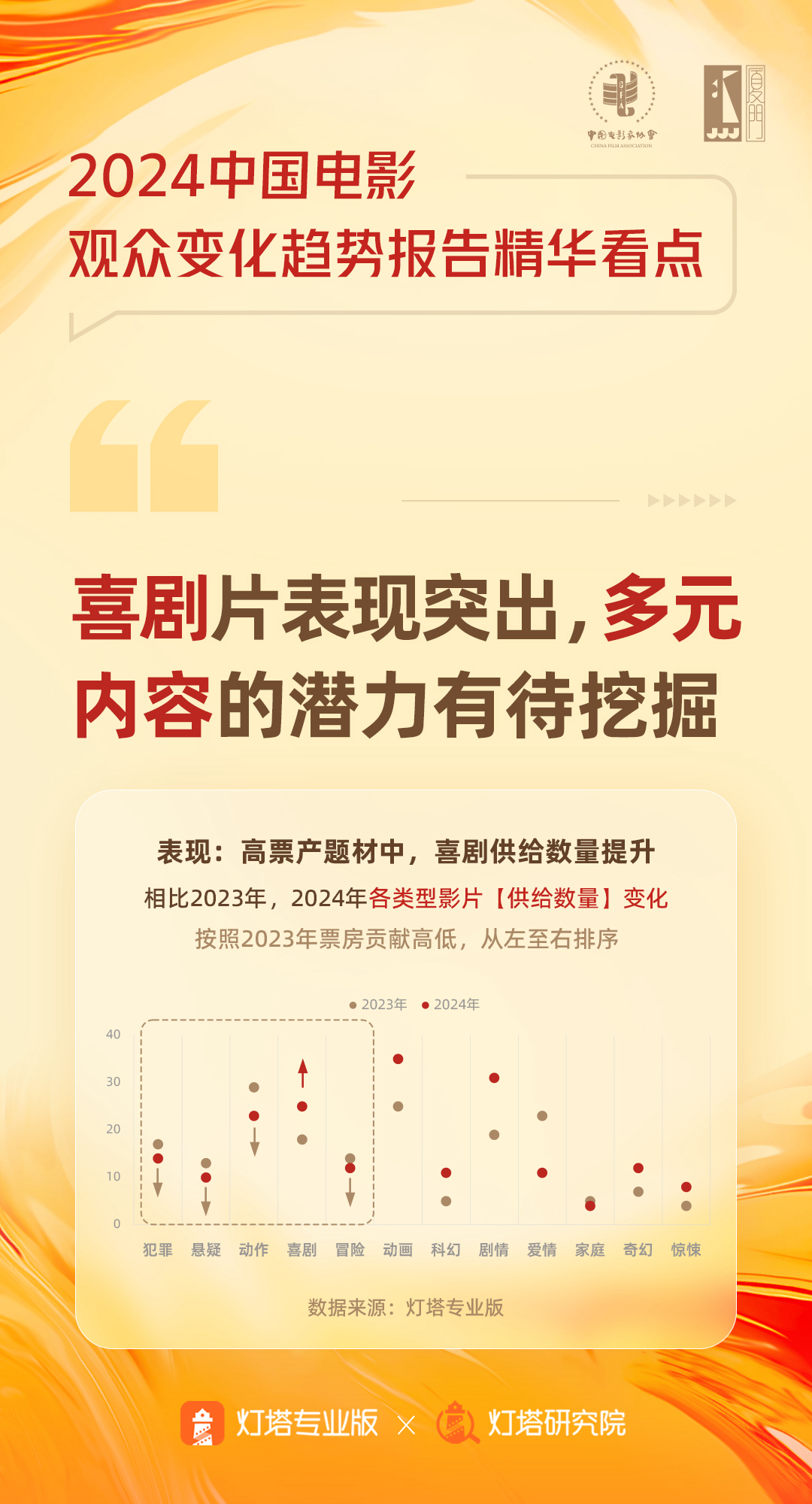 《2024中國(guó)電影觀眾變化趨勢(shì)報(bào)告》由燈塔研究院×燈塔專業(yè)版聯(lián)合于金雞獎(jiǎng)·鼓浪嶼論壇特別發(fā)布?!秷?bào)告》顯示,2024年節(jié)假日檔期票房活躍,女性及95后觀眾成為電影市場(chǎng)觀影主力。在內(nèi)容偏好方面,數(shù)據(jù)顯示,2024年觀眾對(duì)喜劇、懸疑、科幻、動(dòng)作四大類型電影青睞有加,喜劇類型片供給數(shù)量及票房貢獻(xiàn)突出。
