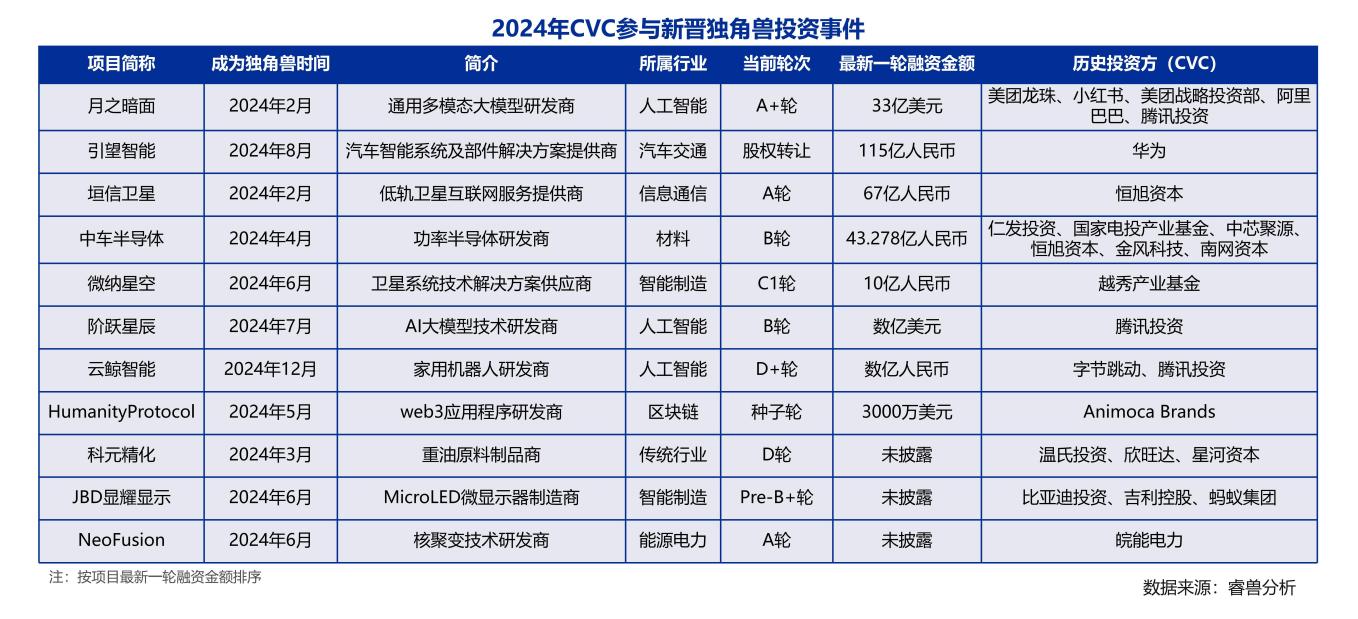 在我國獨(dú)角獸企業(yè)成長過程中,CVC扮演著重要的角色,對新興創(chuàng)業(yè)公司的投資和孵化也起到了關(guān)鍵作用。截止2024年12月底,中國存量獨(dú)角獸共512家,其中中國CVC參與過投資的有371家,占比72.5%,2024年國內(nèi)共新增20家獨(dú)角獸,其中有11家獨(dú)角獸有中國CVC參與投資,占比55%。