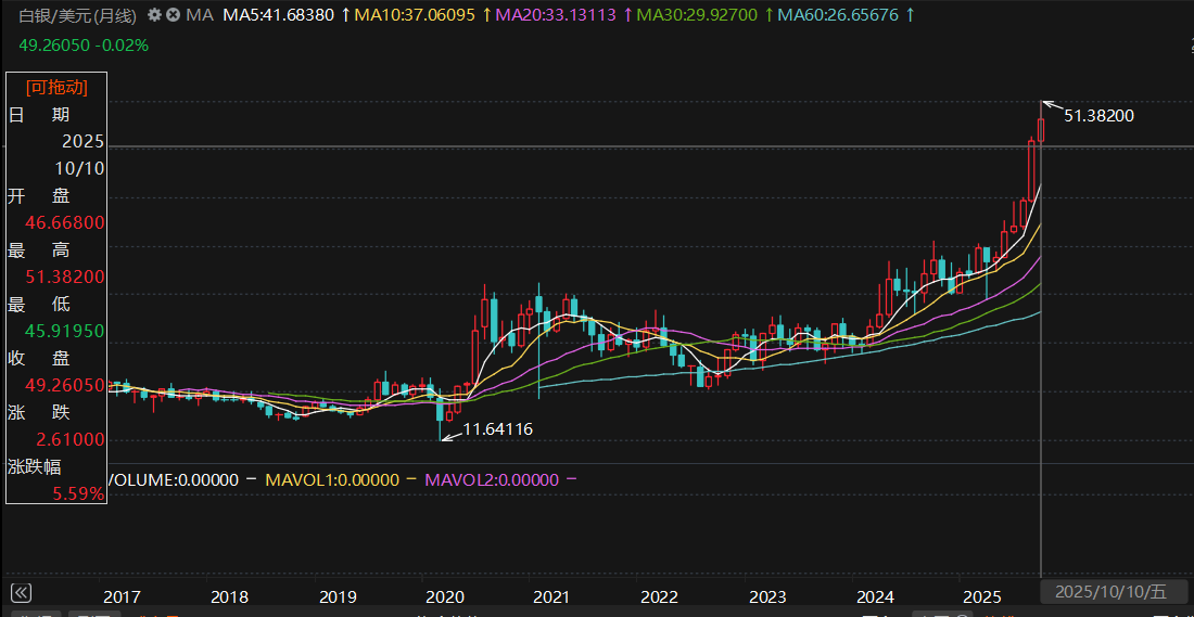 10月9日,現貨白銀價格突破50美元/盎司,為歷史首次。10月10日,據東方財富Choice數據,白銀開盤價報46.67美元/盎司,最高達51.38美元/盎司,年內漲幅超70%。