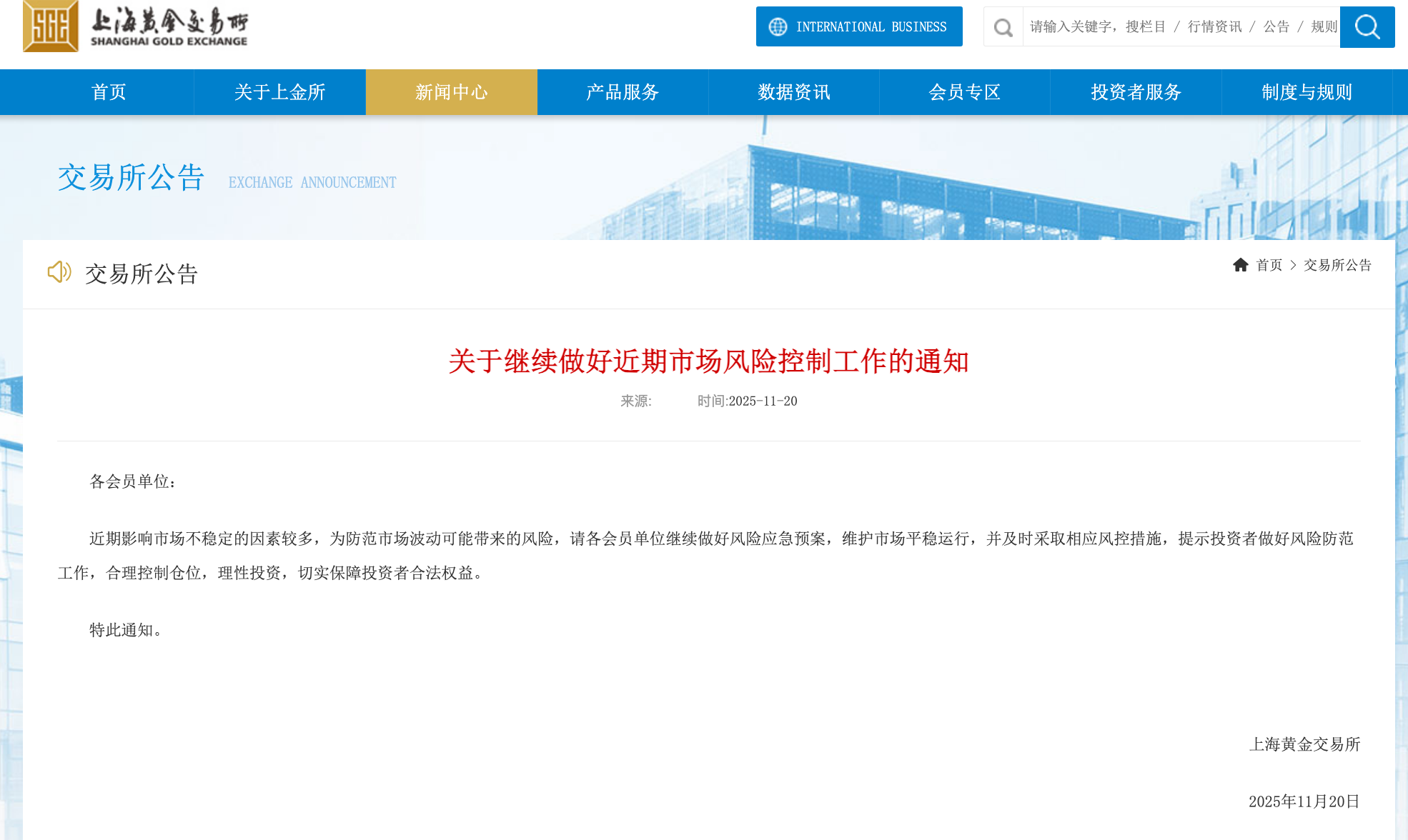 11月20日,上海黃金交易所發(fā)布《關(guān)于繼續(xù)做好近期市場(chǎng)風(fēng)險(xiǎn)控制工作的通知》(以下簡(jiǎn)稱《通知》)。《通知》表示,近期影響市場(chǎng)不穩(wěn)定的因素較多,為防范市場(chǎng)波動(dòng)可能帶來的風(fēng)險(xiǎn),請(qǐng)各會(huì)員單位繼續(xù)做好風(fēng)險(xiǎn)應(yīng)急預(yù)案,維護(hù)市場(chǎng)平穩(wěn)運(yùn)行,并及時(shí)采取相應(yīng)風(fēng)控措施,提示投資者做好風(fēng)險(xiǎn)防范工作,合理控制倉位,理性投資,切實(shí)保障投資者合法權(quán)益。