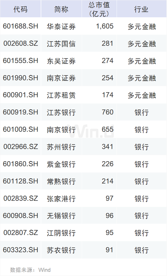 從目前上市公司情況來看,江蘇共有14家金融類上市公司,9家銀行及5家多元金融企業(yè)(包括證券、信托、金融租賃)。從相關公司總市值來看,除華泰證券(19.650,0.29,1.50%)超過1000億元以外,其余公司總市值相對較低,此外,還有4家農(nóng)商行總市值不足100億元。