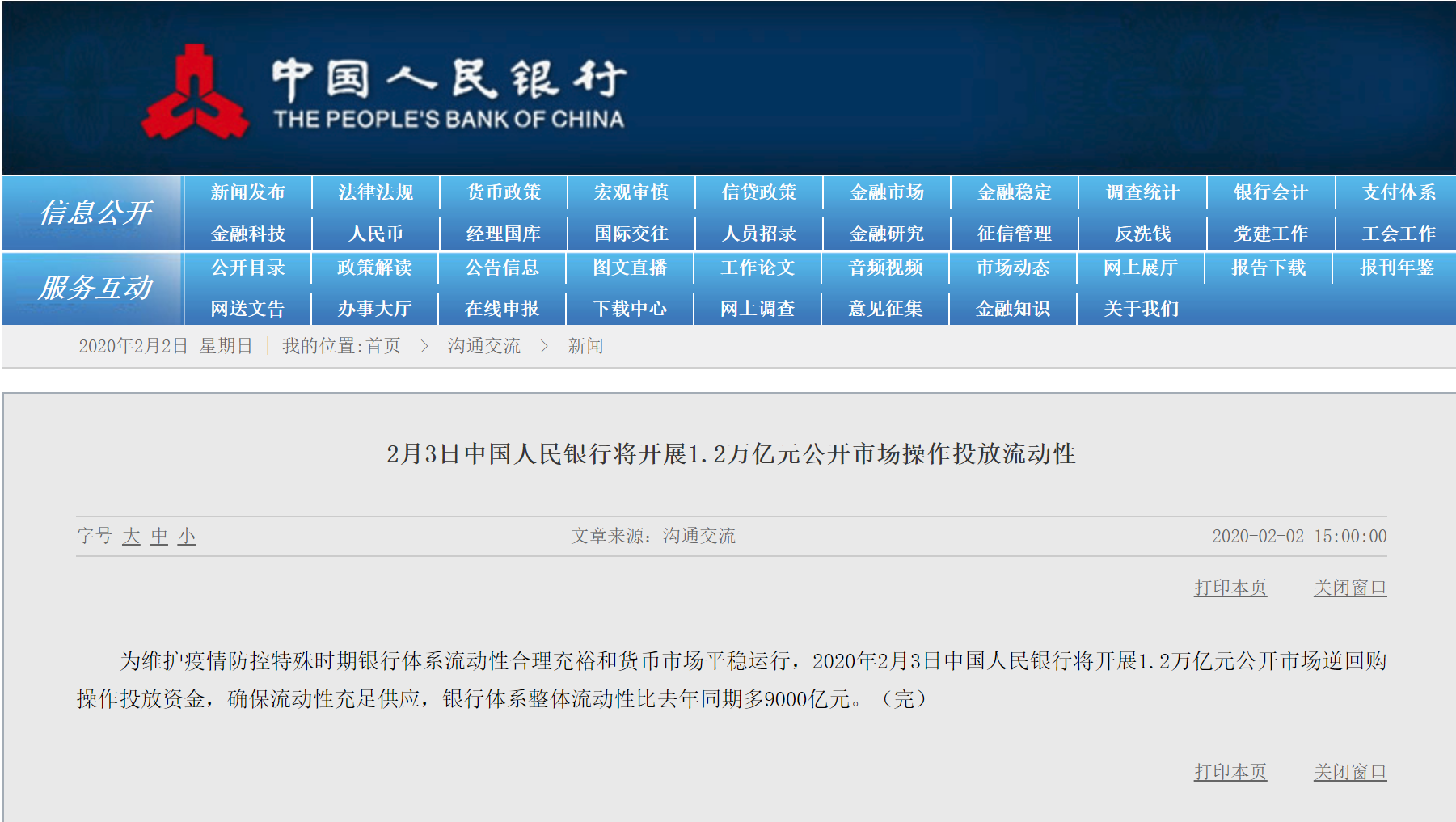 2月2日,央行發(fā)布公告,為維護疫情防控特殊時期銀行體系流動性合理充裕和貨幣市場平穩(wěn)運行,2020年2月3日中國人民銀行將開展1.2萬億元公開市場逆回購操作投放資金,確保流動性充足供應(yīng),銀行體系整體流動性比去年同期多9000億元。