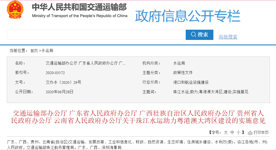 近日,交通運輸部官網(wǎng)發(fā)布《關(guān)于珠江水運助力粵港澳大灣區(qū)建設(shè)的實施意見》(下簡稱《實施意見》)。