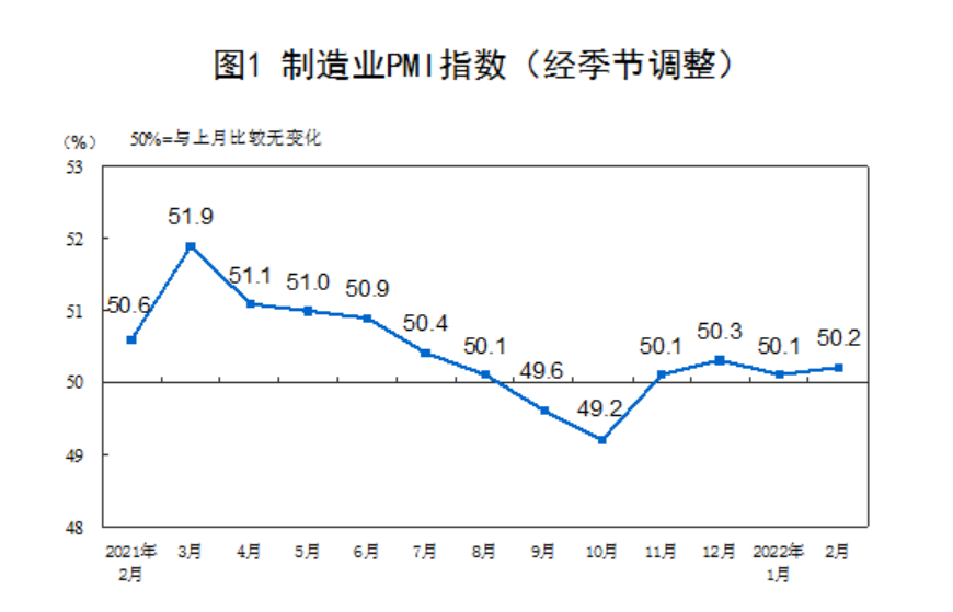 據(jù)國家統(tǒng)計局3月1日消息,2月份,中國制造業(yè)采購經(jīng)理指數(shù)(PMI)為50.2%,比上月上升0.1個百分點,繼續(xù)高于臨界點,制造業(yè)景氣水平略有上升。