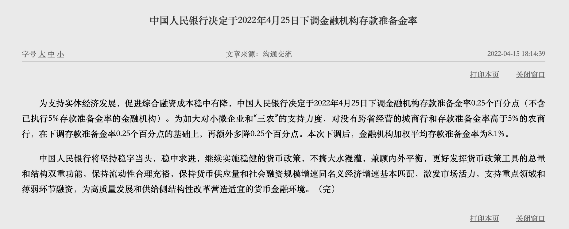 央行決定于4月25日降準(zhǔn)0.25個(gè)百分點(diǎn)2022-04-15 19:05