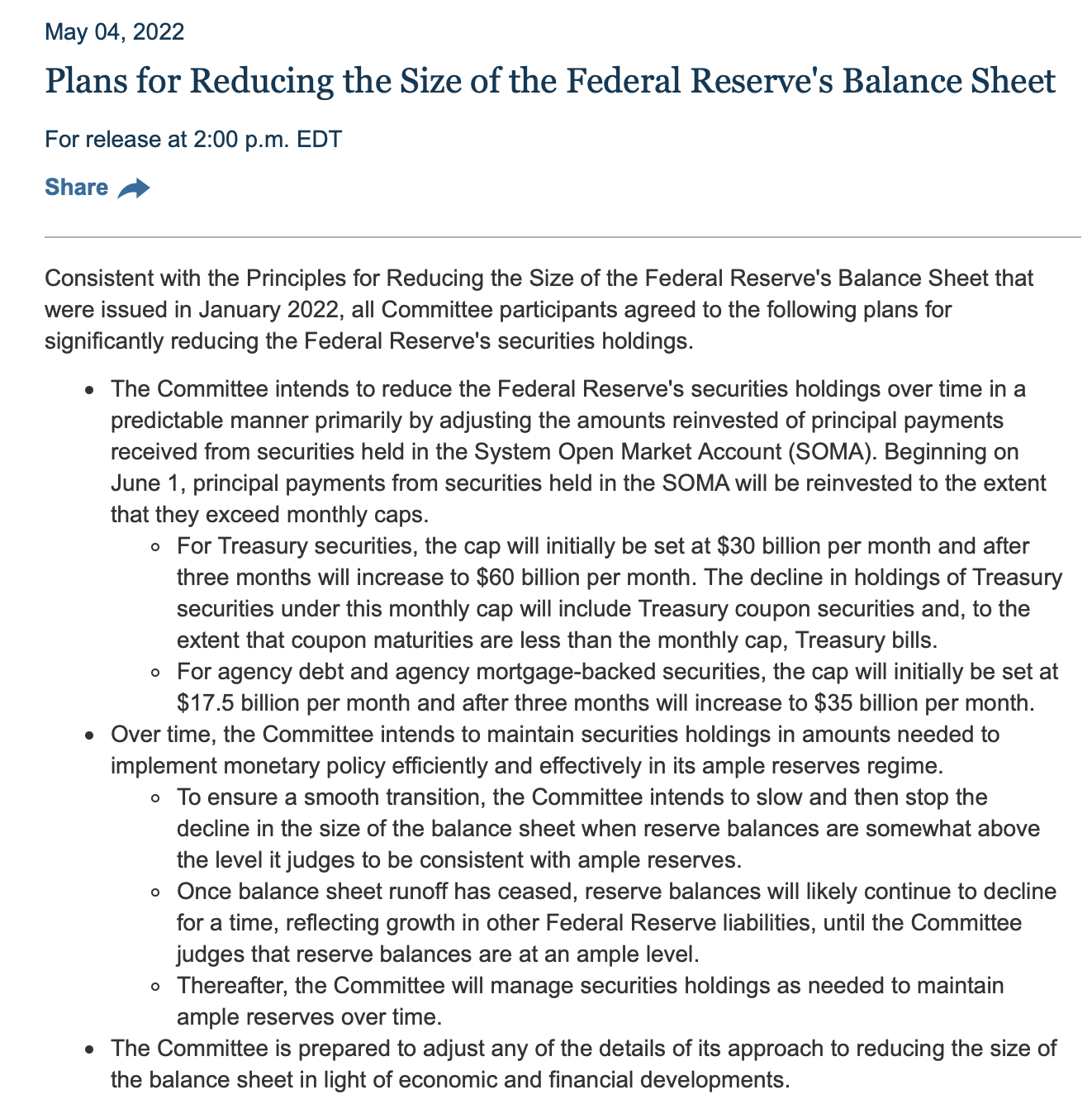 另外,據(jù)美聯(lián)儲(chǔ)FOMC聲明顯示,委員會(huì)決定從6月1日開(kāi)始減少其持有的國(guó)債、機(jī)構(gòu)債務(wù)和機(jī)構(gòu)抵押貸款支持證券。根據(jù)縮表計(jì)劃,美聯(lián)儲(chǔ)將從6月開(kāi)始以每個(gè)月475億美元的速度縮表,其中美債300億元美元,機(jī)構(gòu)債務(wù)和機(jī)構(gòu)抵押貸款支持證券為175億美元;三個(gè)月之后,每個(gè)月的縮表力度將擴(kuò)大至最高950億美元,其中美債600億元美元,機(jī)構(gòu)債務(wù)和機(jī)構(gòu)抵押貸款支持證券為350億美元。