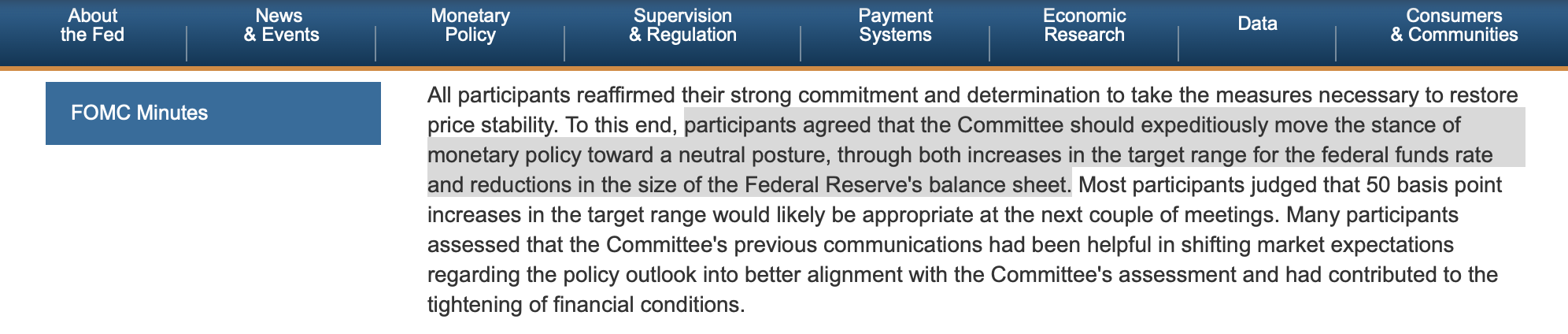 值得關(guān)注的是,此次會(huì)議似乎也暗示了接下來的加息路徑。會(huì)議紀(jì)要顯示,與會(huì)者一致認(rèn)為,委員會(huì)應(yīng)通過提高聯(lián)邦基金利率目標(biāo)范圍和減少美聯(lián)儲(chǔ)資產(chǎn)負(fù)債表規(guī)模,迅速將貨幣政策立場轉(zhuǎn)向中性姿態(tài)。大多數(shù)與會(huì)者認(rèn)為,在接下來的幾次會(huì)議上,將目標(biāo)范圍提高50個(gè)基點(diǎn)可能是合適的。