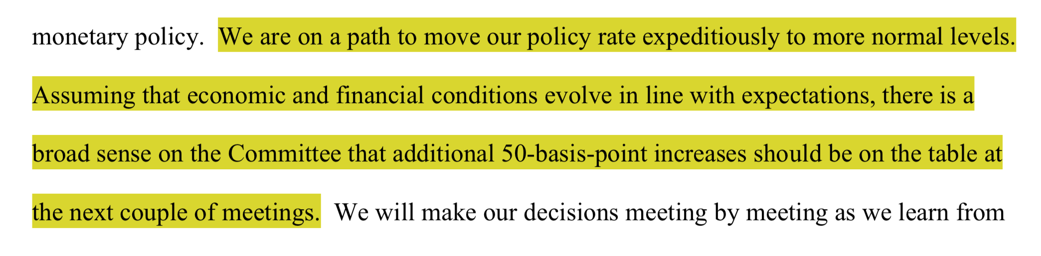 美聯(lián)儲(chǔ)主席鮑威爾也在會(huì)后的新聞發(fā)布會(huì)上談道,“我們正在將政策利率迅速提高到更正常的水平,假設(shè)經(jīng)濟(jì)和金融狀況的發(fā)展符合預(yù)期,委員會(huì)普遍認(rèn)為,在接下來的幾次會(huì)議上應(yīng)該考慮再增加50個(gè)基點(diǎn)”。