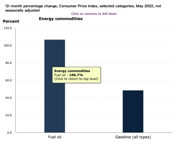 能源價(jià)格指數(shù)同比上漲34.6%,是自2005年9月份以來(lái)最大的同比漲幅。其中燃料油在5月份上漲了16.9%,12個(gè)月內(nèi)漲幅達(dá)到了106.7%。汽油價(jià)格在12個(gè)月內(nèi)漲幅也達(dá)到了48.7%。