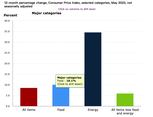 根據(jù)美國(guó)勞工統(tǒng)計(jì)局公布的5月份居民消費(fèi)價(jià)格指數(shù)(CPI)數(shù)據(jù)顯示,5月份CPI同比上漲8.6%,為1981年12月以來(lái)新高;環(huán)比上漲1%,顯著高于預(yù)期的0.7%。其中能源成本的飆升推動(dòng)了整體CPI數(shù)據(jù)的上漲。