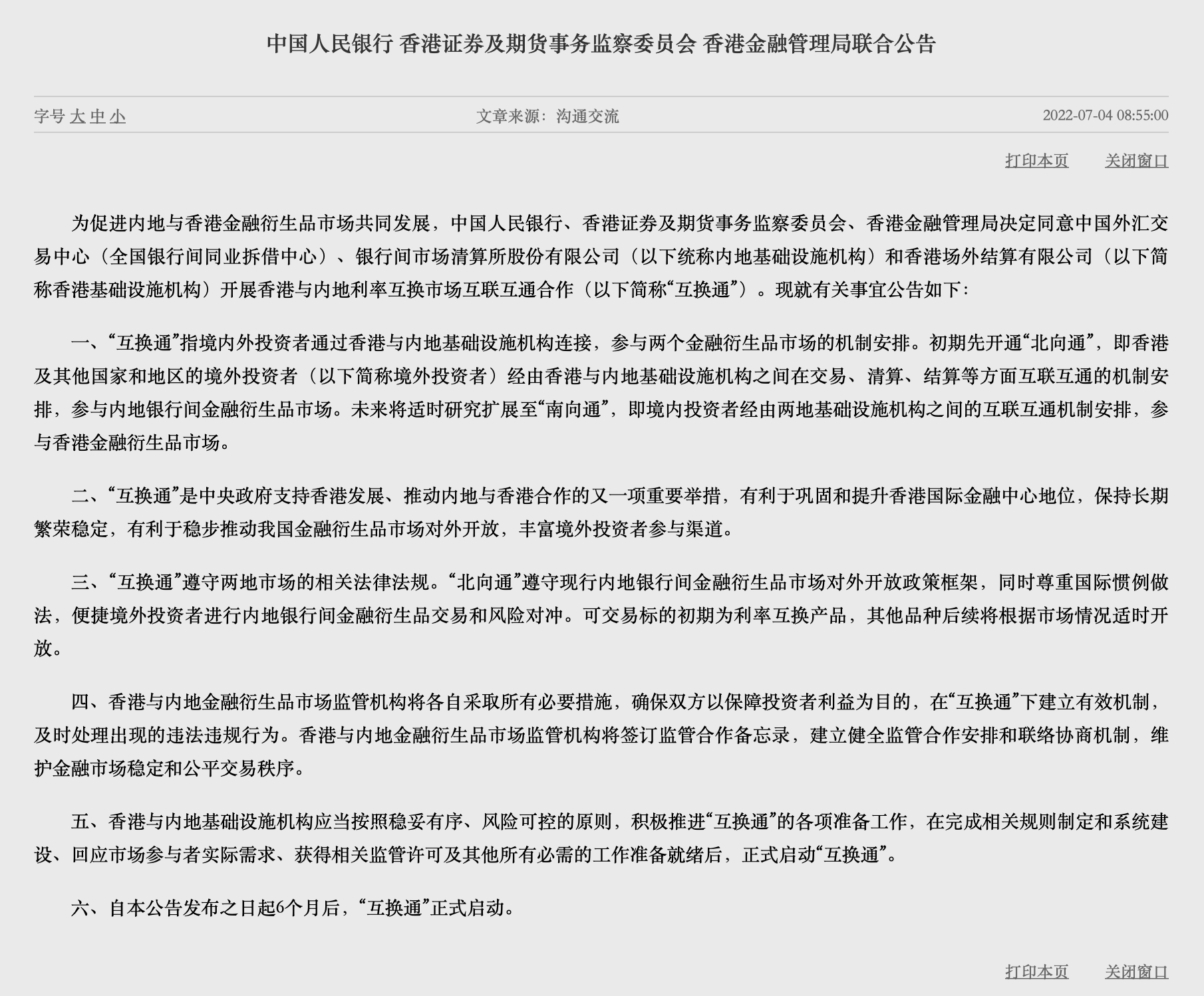 7月4日,中國人民銀行發(fā)布消息,為促進內(nèi)地與香港金融衍生品市場共同發(fā)展,中國人民銀行、香港證券及期貨事務(wù)監(jiān)察委員會(下稱“香港證監(jiān)會”)、香港金融管理局(下稱“香港金管局”)決定同意中國外匯交易中心(全國銀行間同業(yè)拆借中心)、銀行間市場清算所股份有限公司和香港場外結(jié)算有限公司開展香港與內(nèi)地利率互換市場互聯(lián)互通合作(下稱“互換通”)。