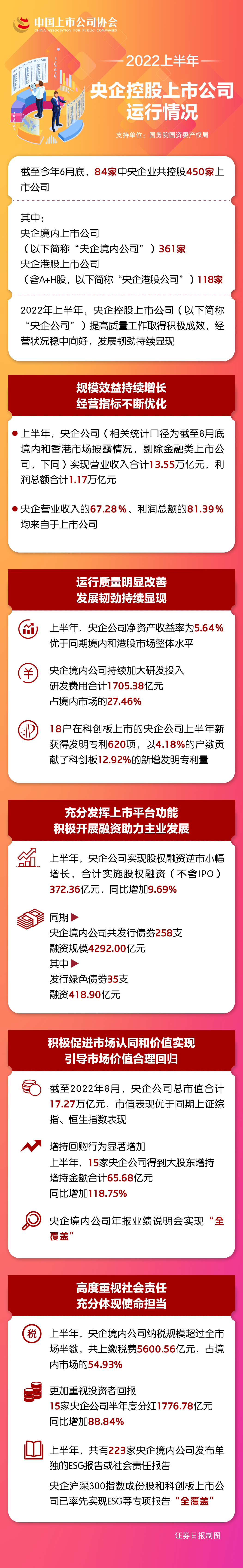 據(jù)中國上市公司協(xié)會(以下簡稱“中上協(xié)”)消息,9月23日,中上協(xié)發(fā)布《央企控股上市公司2022年上半年運(yùn)行情況報告》(以下簡稱《報告》)。