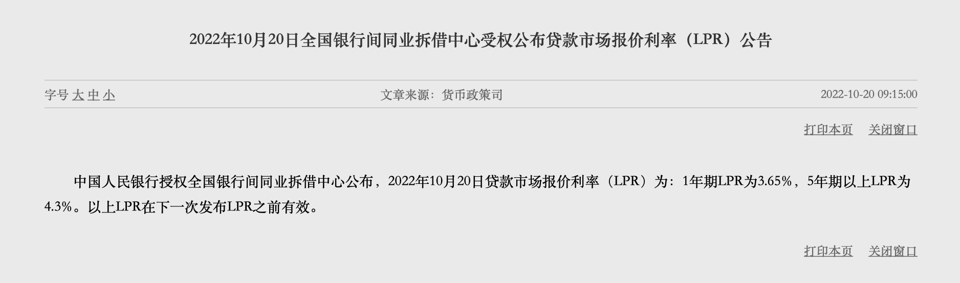 10月20日,最新一期市場報價利率(LPR)出爐。中國人民銀行授權(quán)全國銀行間同業(yè)拆借中心公布:1年期LPR為3.65%,5年期以上LPR為4.3%。