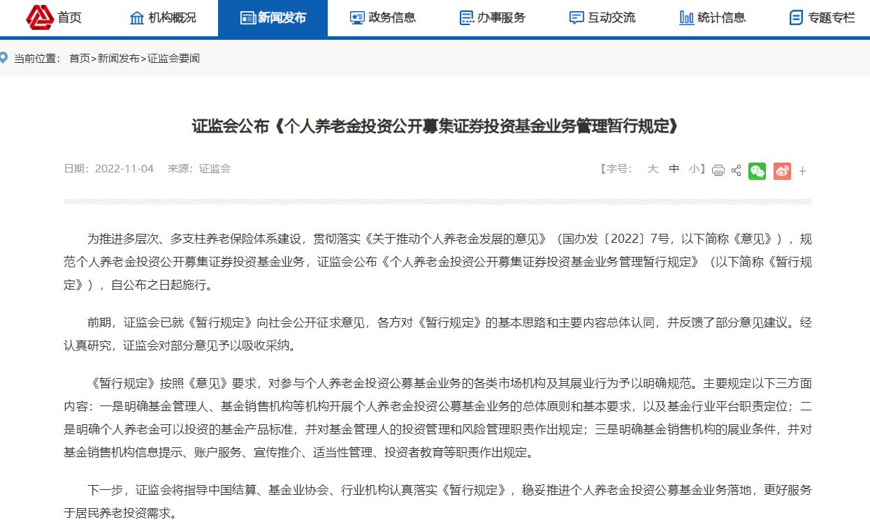 11月4日,人力資源社會保障部、財政部、國家稅務(wù)總局、銀保監(jiān)會、證監(jiān)會聯(lián)合發(fā)布《個人養(yǎng)老金實施辦法》后,證監(jiān)會發(fā)布《個人養(yǎng)老金投資公開募集證券投資基金業(yè)務(wù)管理暫行規(guī)定》(以下簡稱《暫行規(guī)定》),自公布之日起施行。據(jù)悉,基金產(chǎn)品方面,在個人養(yǎng)老金制度試行階段,優(yōu)先納入符合條件的養(yǎng)老目標(biāo)基金。