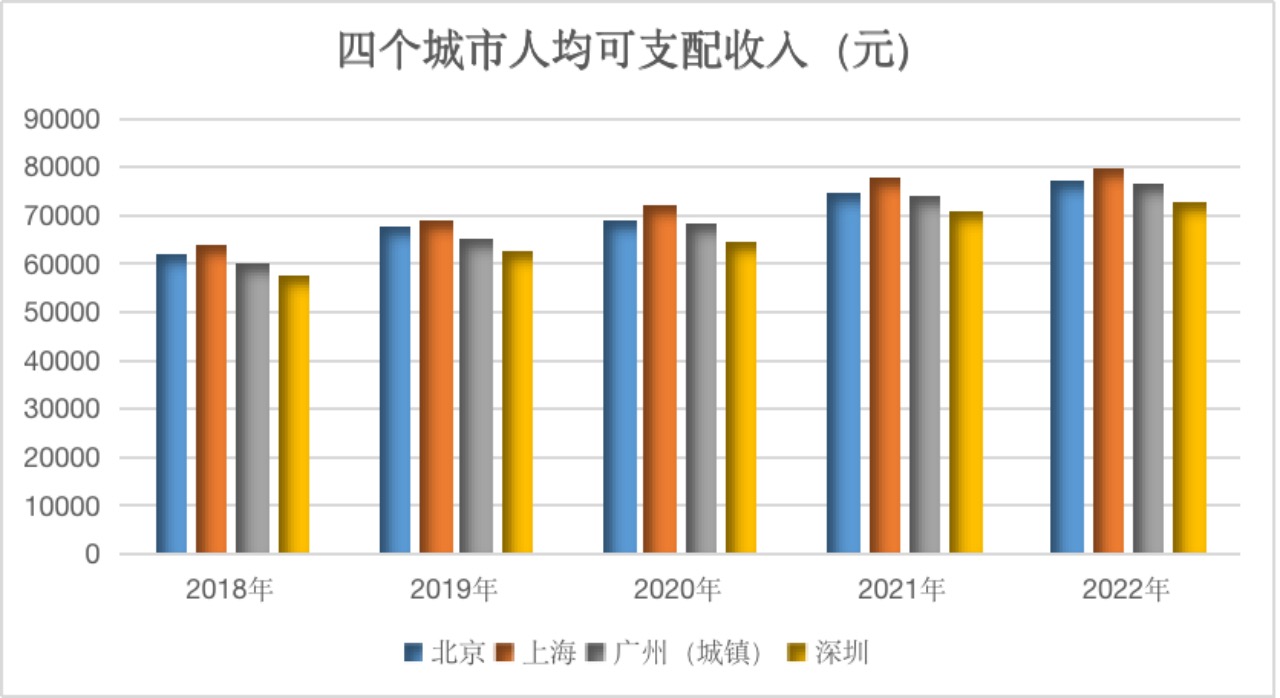 深圳:2022年深圳居民人均可支配收入72718元,同比增長2.6%;2023年居民人均可支配收入穩(wěn)步增長。