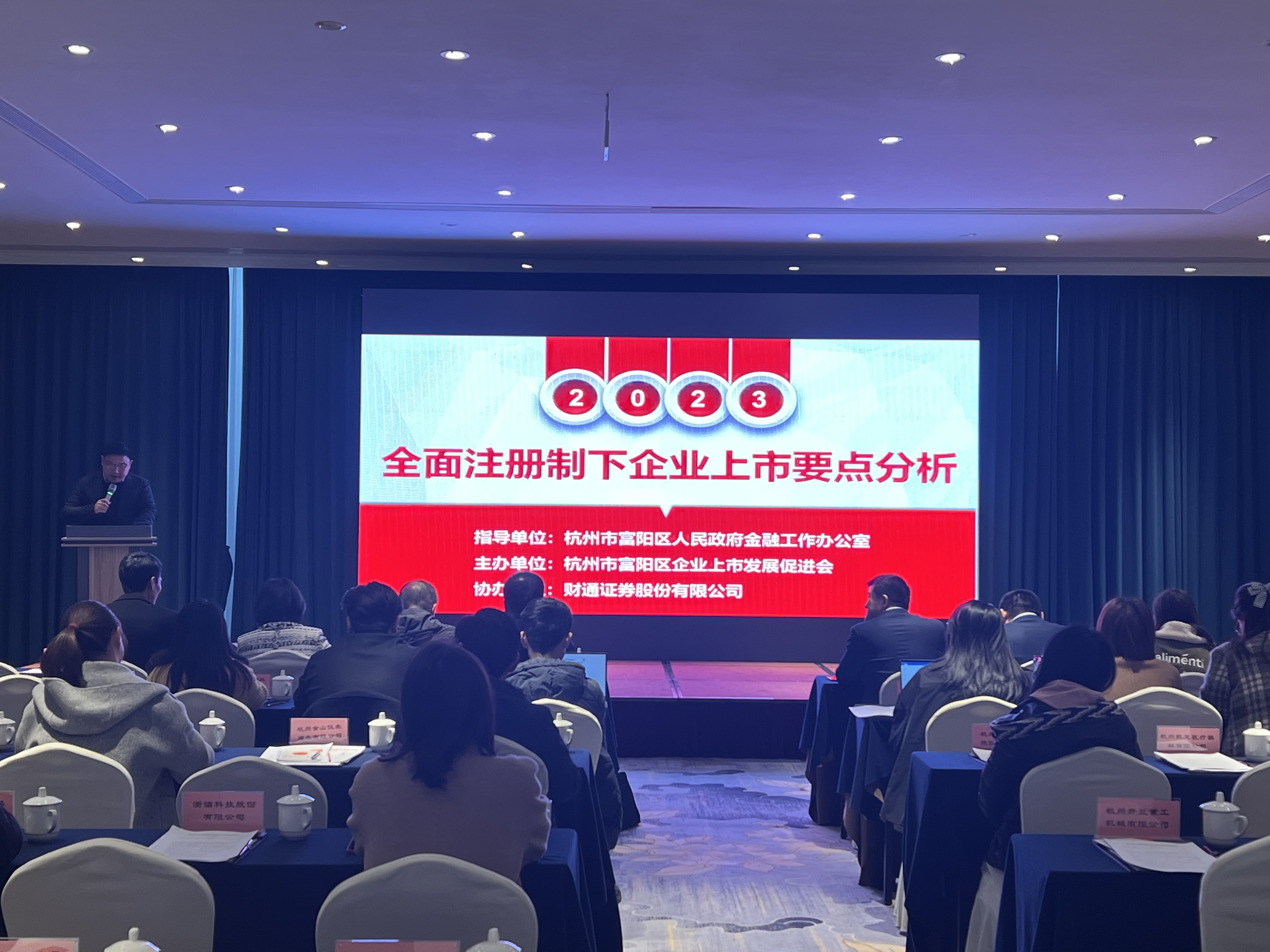 近日,全面注冊(cè)制下企業(yè)上市要點(diǎn)分析會(huì)在杭州市富陽(yáng)區(qū)舉行。本次活動(dòng)由富陽(yáng)區(qū)金融辦、區(qū)應(yīng)急管理局指導(dǎo),富陽(yáng)區(qū)企業(yè)上市促進(jìn)會(huì)、財(cái)通證券投資銀行總部承辦。活動(dòng)現(xiàn)場(chǎng)超50位區(qū)內(nèi)上市后備企業(yè)及相關(guān)企業(yè)代表參會(huì)。