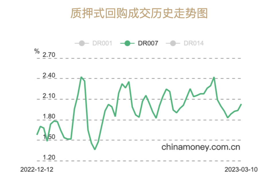 從資金價(jià)格來看,上周前四個(gè)交易日資金面延續(xù)前一周的寬松局面。據(jù)中國貨幣網(wǎng)數(shù)據(jù)顯示,3月6日DR007加權(quán)平均利率1.8253%,為本月以來最低,隨后開始向上。3月10日,DR007加權(quán)平均利率升至政策利率水平(2%)上方報(bào)2.0253%。