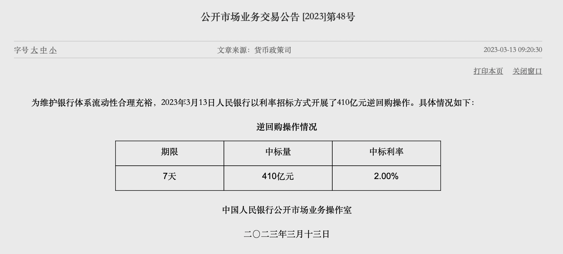 央行開展410億元逆回購操作 實(shí)現(xiàn)凈投放340億元2023-03-13 10:30