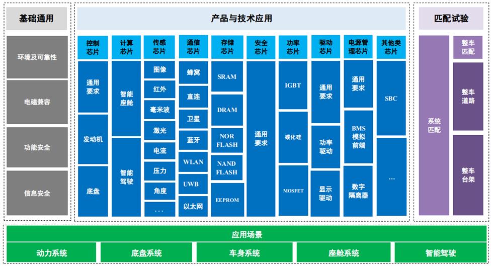 汽車芯片標準體系技術(shù)結(jié)構(gòu),以“汽車芯片應用場景”為橫向出發(fā)點,包括動力系統(tǒng)、底盤系統(tǒng)、車身系統(tǒng)、座艙系統(tǒng)及智能駕駛五個方面;向上延伸形成基于應用場景需求的汽車芯片各項技術(shù)規(guī)范和試驗方法,根據(jù)標準內(nèi)容分為基礎通用、產(chǎn)品與技術(shù)應用和匹配試驗三類標準。